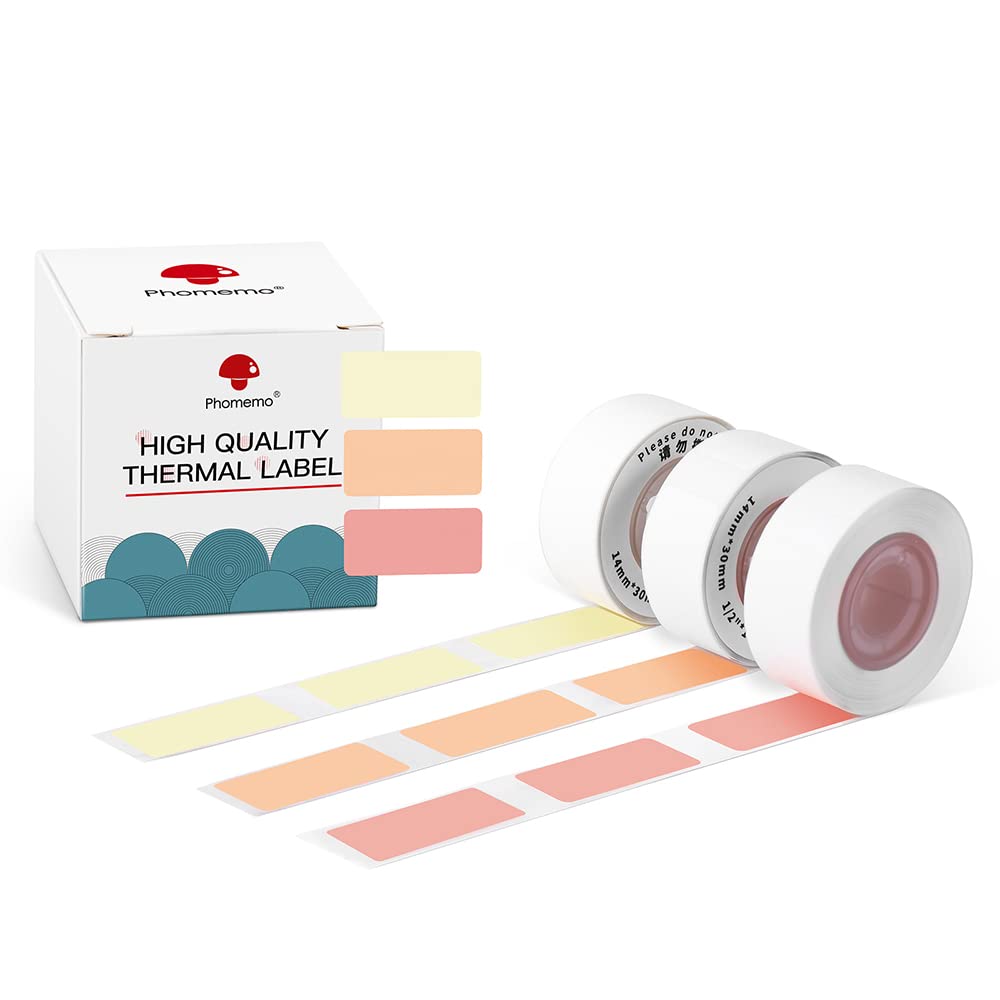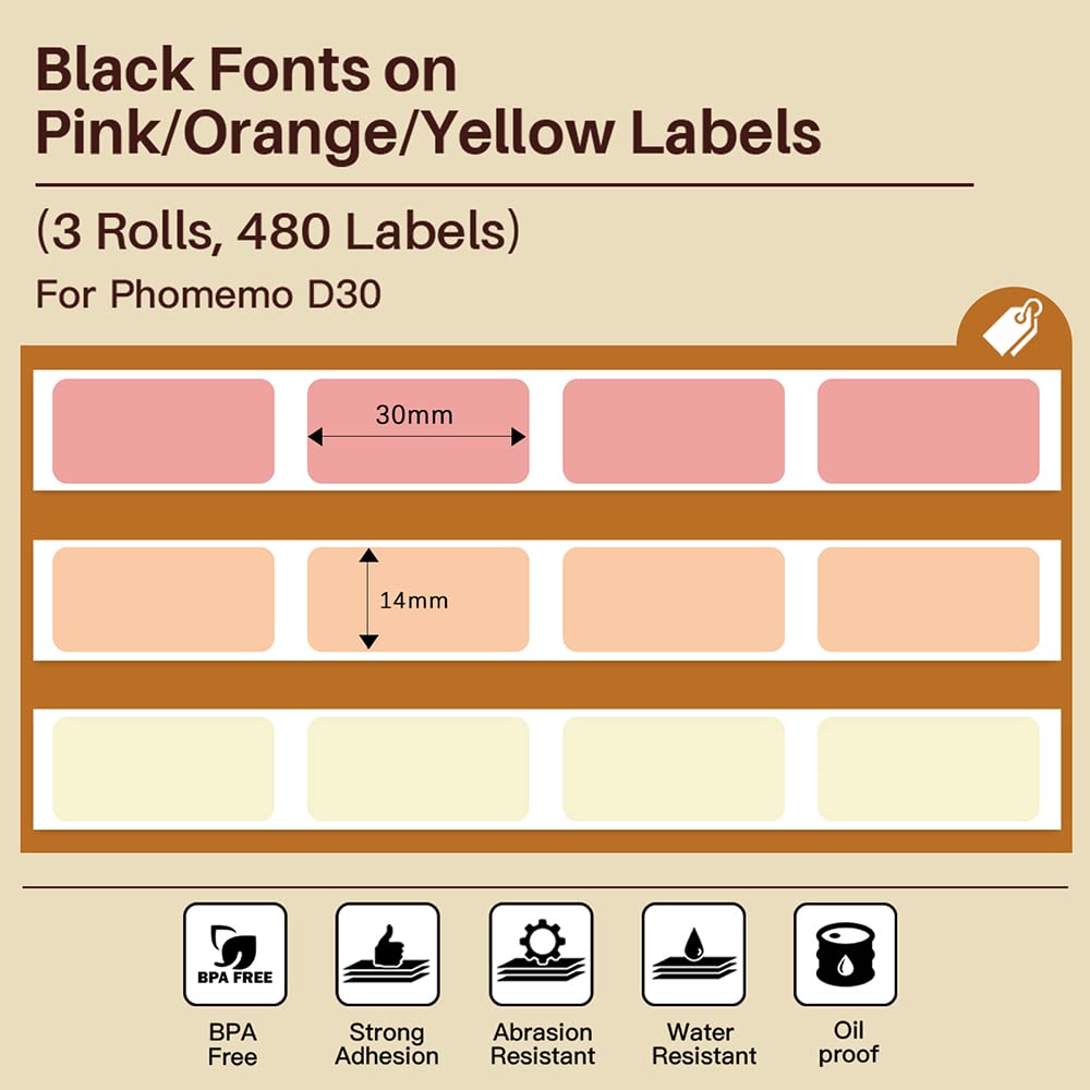 Phomemo D30 etiketler. Turuncu, kendinden yap??kanl?, su ge?irmez, ya?a dayan?kl? ve ?izilmez, 14 mm x 30 mm, D30 etiket makinesi ile uyumlu, 3 rulo