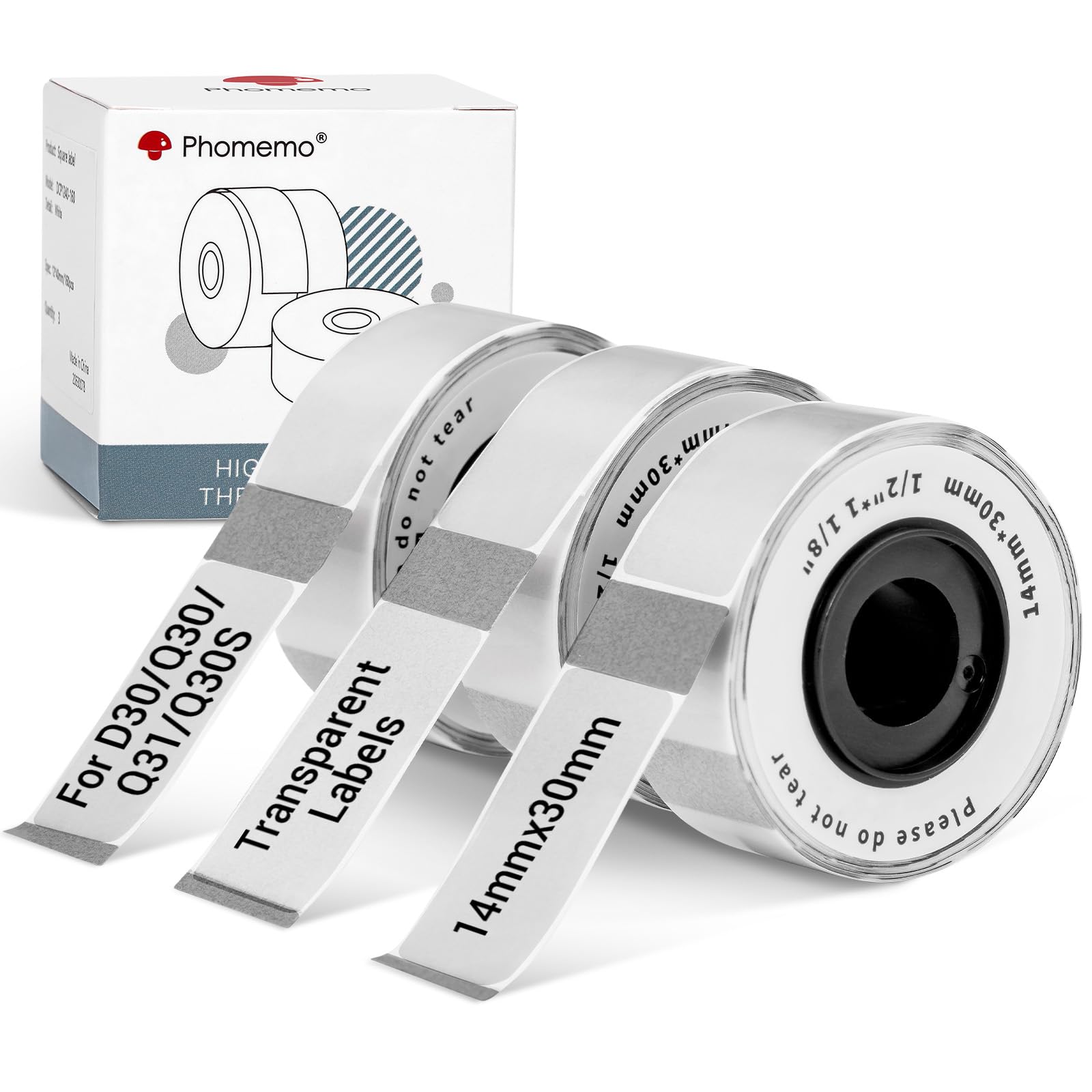 Phomemo D30 Étiquettes, 14 × 30 mm Étiquettes Transparentes Autocollantes pour Imprimante d'étiquettes Phomemo Q30S, Q30, D30, 210 Etiquettes/par Rouleau, 3 Rouleaux