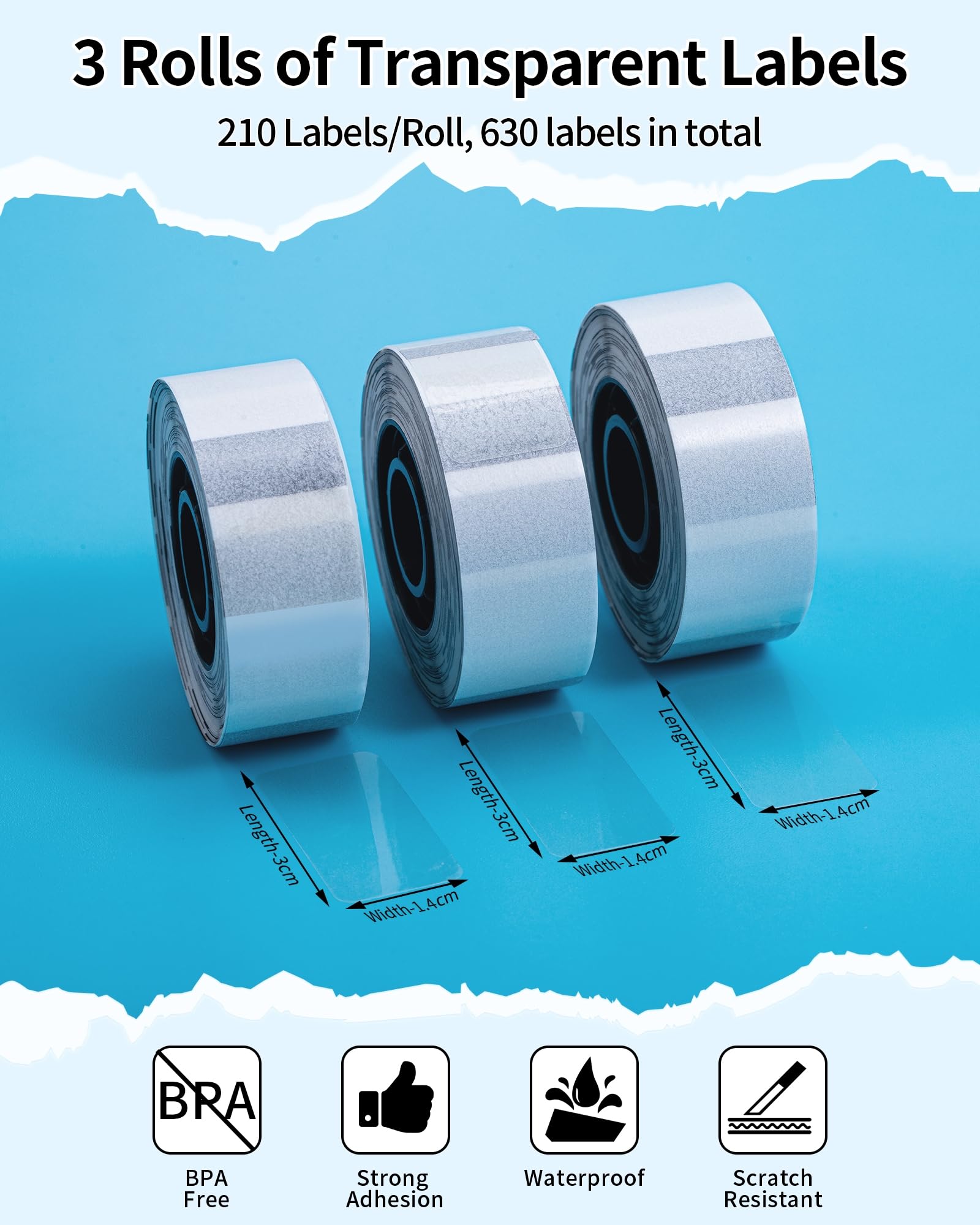 - [Vous obtiendrez] - 3 rouleaux d'étiquettes thermiques autocollantes transparentes, 210 étiquettes par rouleau. Les dimensions sont : 14 x 30 mm (0,55 '' x 1,18 ''). Impression en noir et blanc. Ils sont imperméables, résistants à l'abrasion et sans BPA.