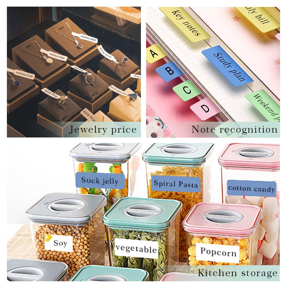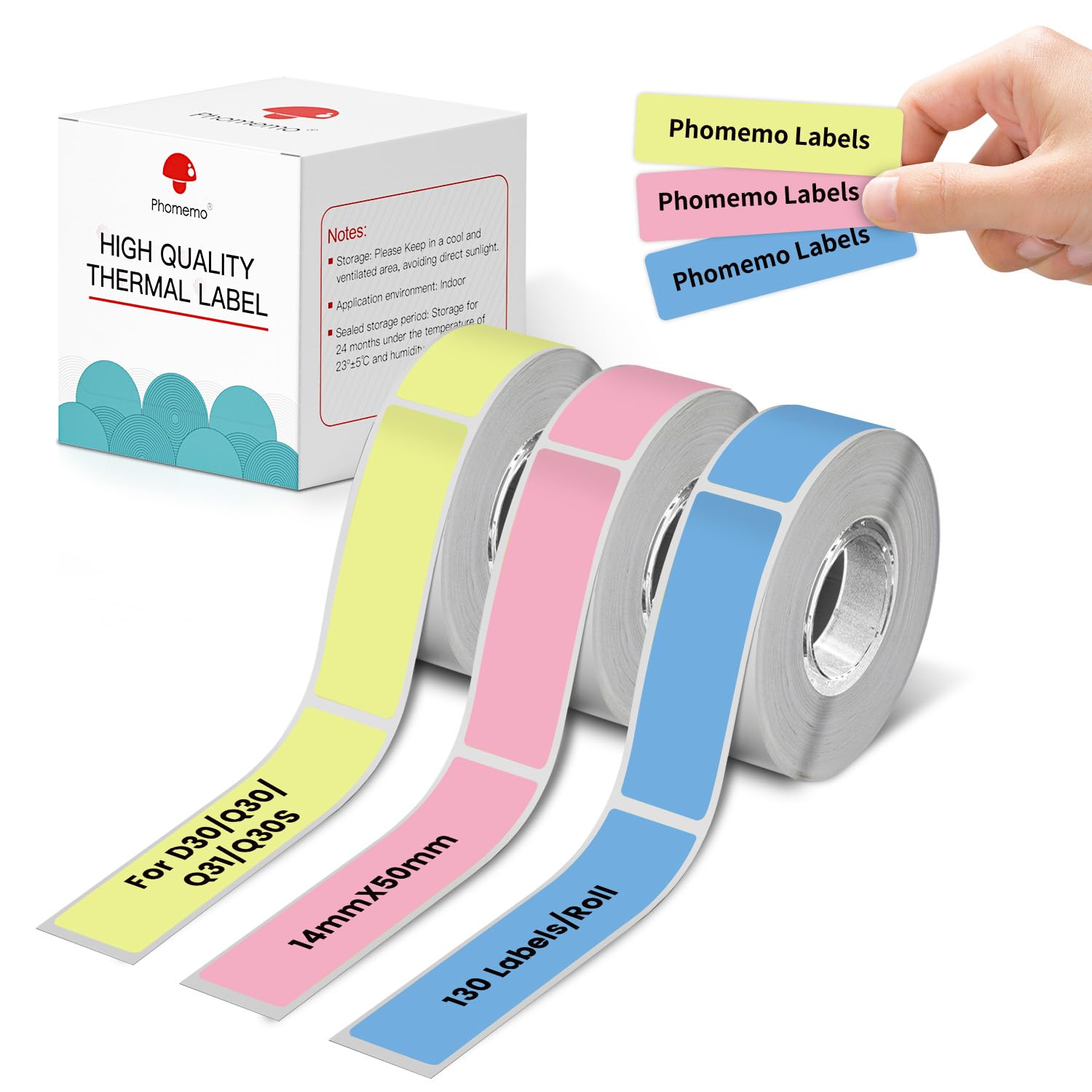 Phomemo D30 Étiquettes autocollantes thermiques, 14 mm*50 mm, compatibles avec l'imprimante d'étiquettes Phomemo D30, 3 rouleaux de 130 étiquettes, bleu mer, poudre de fleur de cerisier, jaune frais