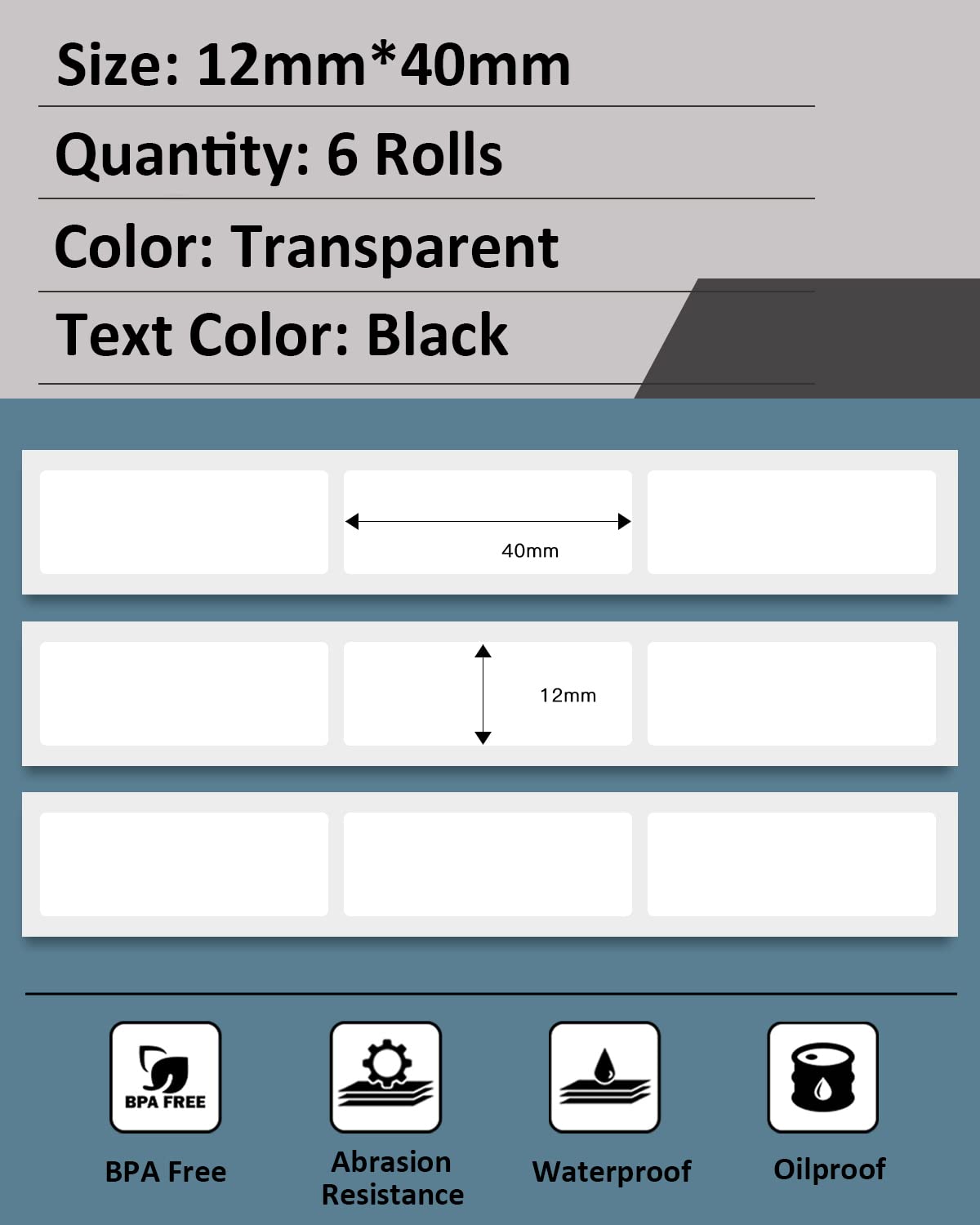 - ¡Ì What you get: 6 roll white label tapes. 12mm X 40mm, 160 labels each roll. Black and white printouts. It's water,abrasion resistant and BPA free.