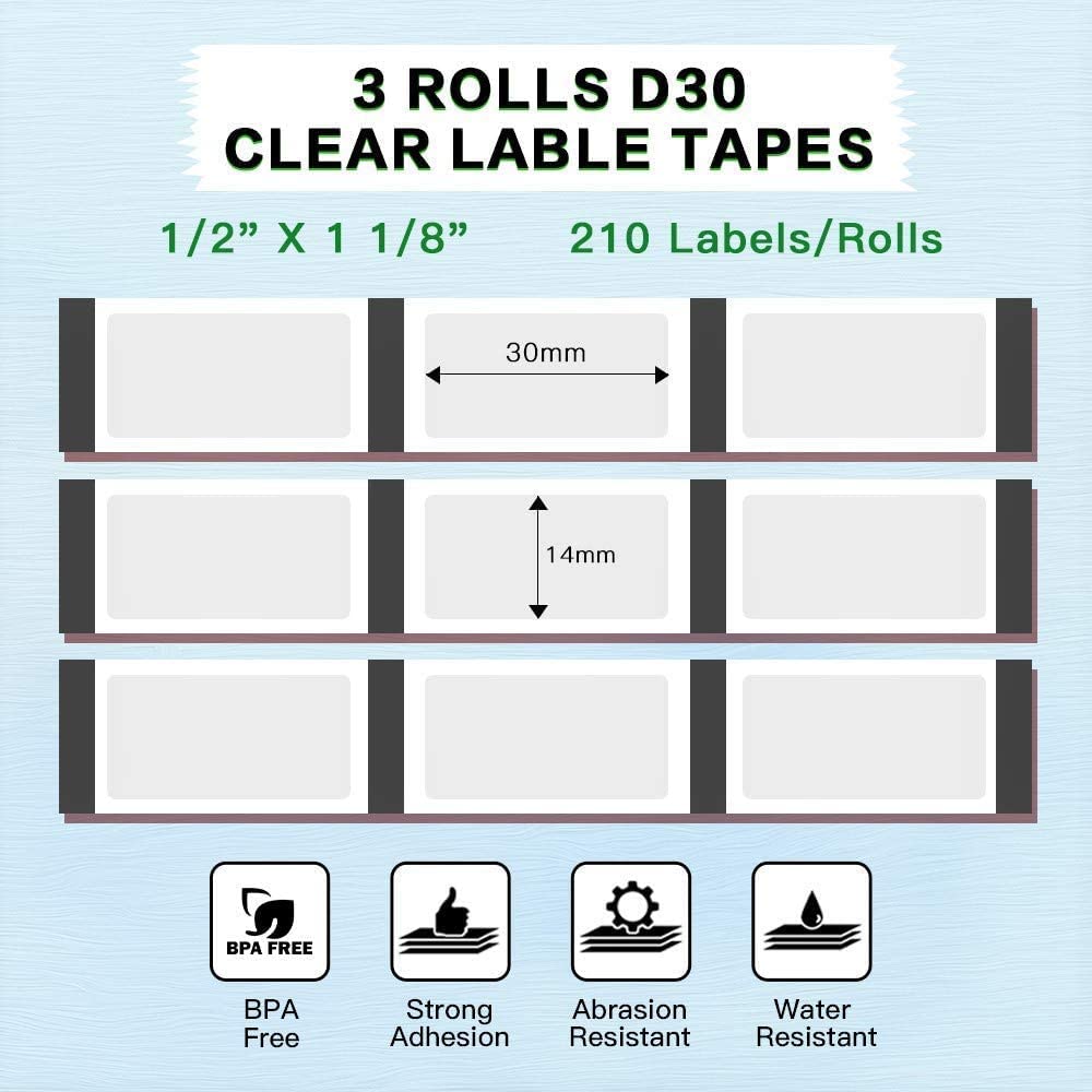 - ¡Ì What you get: 3 roll transparent label tapes. 14mm X 30mm, 210 labels each roll. Black and white printouts. It's water,abrasion resistant and BPA free.