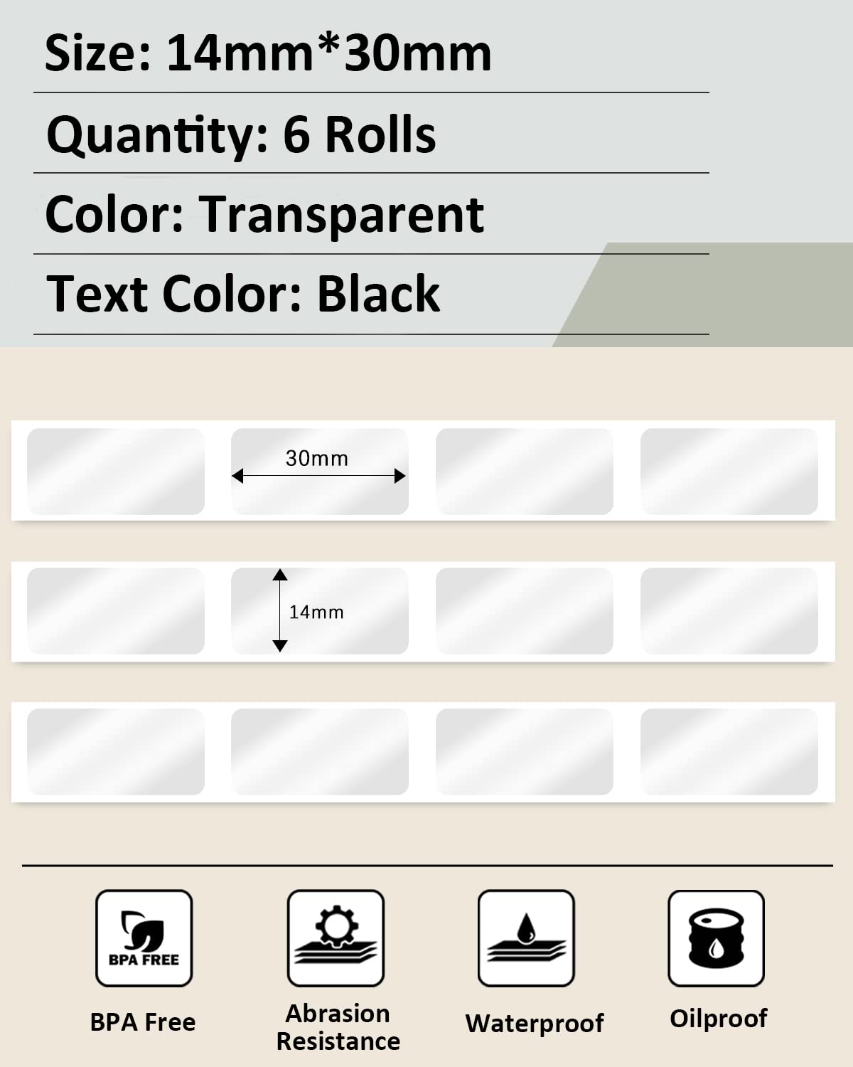 Phomemo D30 Label 14¡Á30mm Transparent Adhesive Thermal Label, 210 Labels/Per Roll, 6 roll, Used for Kitchen Marking, Expiration Date, File Classification and so on