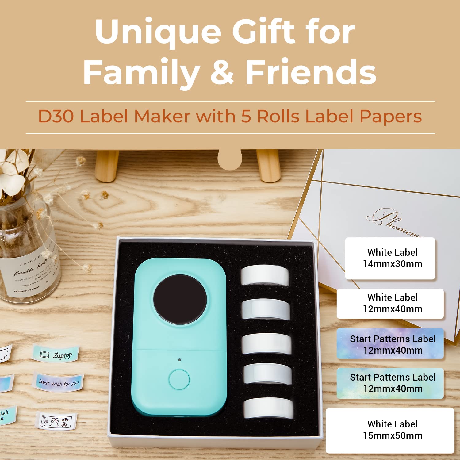 - [Phomemo D30 Label Maker Gift Set]Include a D30 labelling Machine, a white label(12*40mm,160pcs), a white label(14*30mm,210pcs), a white label(15*50mm,130pcs),2 different Star Patterns labels(12*40mm,320pcs). It's a wonderful gift for your loved one, family and friends on Halloween, Thanksgiving, Christmas and other holidays.