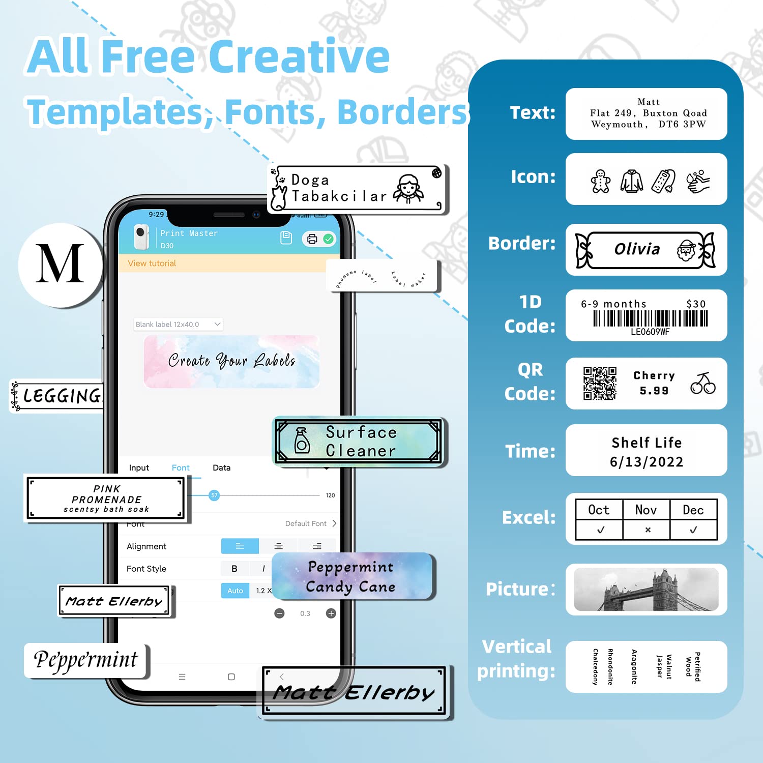 - [Multifunctional App] This sticker maker machine is available to meet the needs of different households and industries. Support multi-language printing, horizontal and vertical version, two-line edit. The ''Print Master'' APP includes more than 10 styles of calligraphy, 80 symbols, various texts, graphic symbols and business icons, add a little element when printing, try to choose some patterns outside the text, inject more vitality into the label, and you could save labels for later re-use.