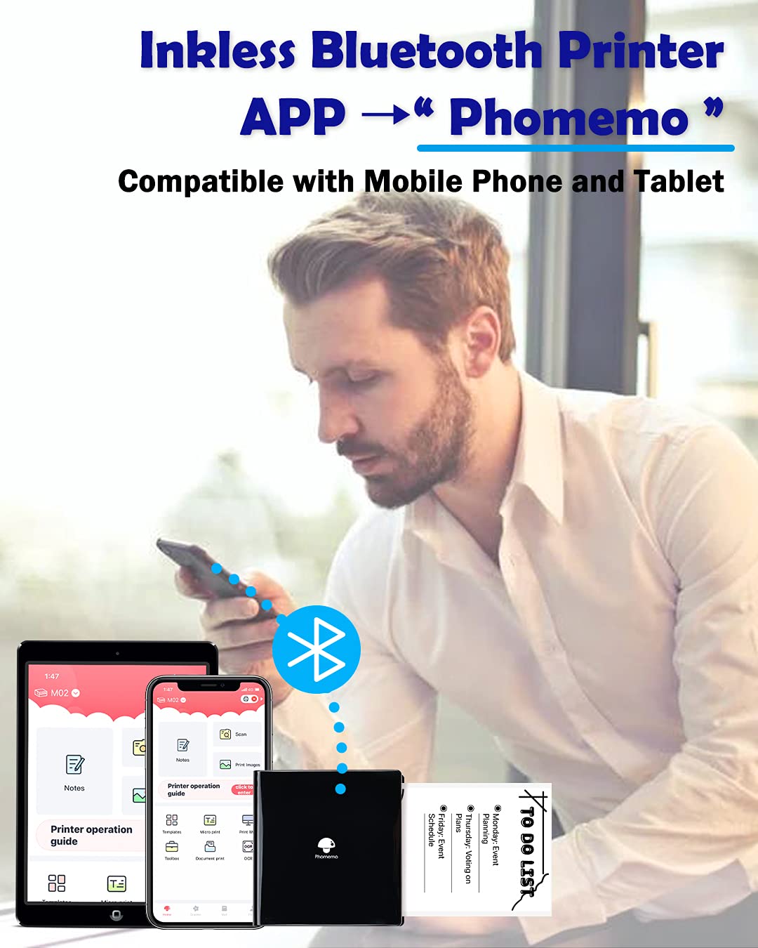 - Bluetooth Pocket Printer Connection- Bluetooth 4.0 connection. Connected to the Phomemo APP through Bluetooth, without wire. System: for android 7.0, for iOS 13.0 or above