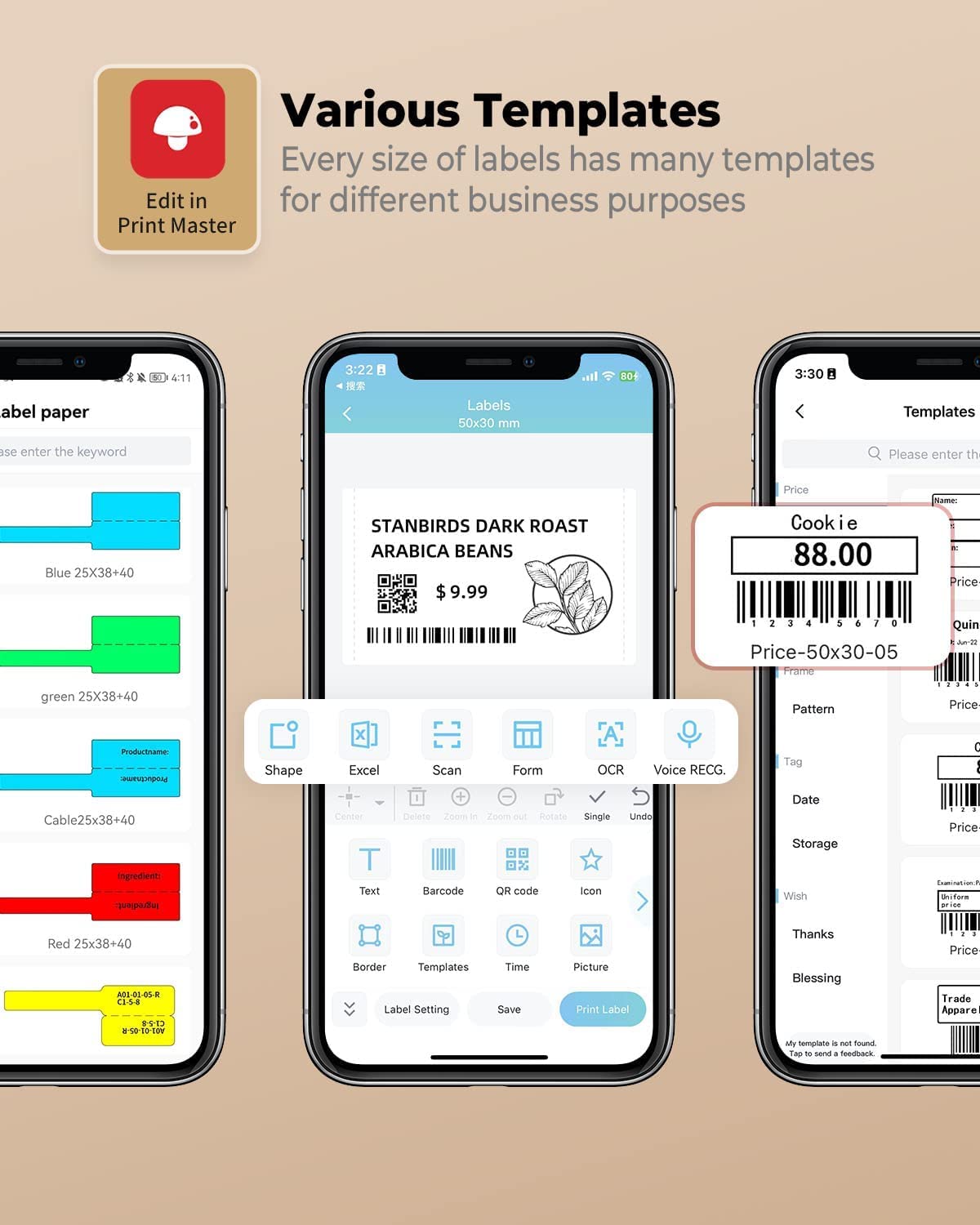 - PODEROSA APP PRINT MASTER : Use la aplicación Print Master, que ofrece todas las plantillas de etiquetas gratuitas y listas para usar para todos los fines mencionados anteriormente para aumentar su eficiencia. También puede configurar y guardar sus propias plantillas. Más de 10 fuentes, más de 500 emojis y más de 40 marcos están disponibles para diseños de etiquetas personalizadas. Con la función OCR en la aplicación Print Master, puede imprimir fácilmente