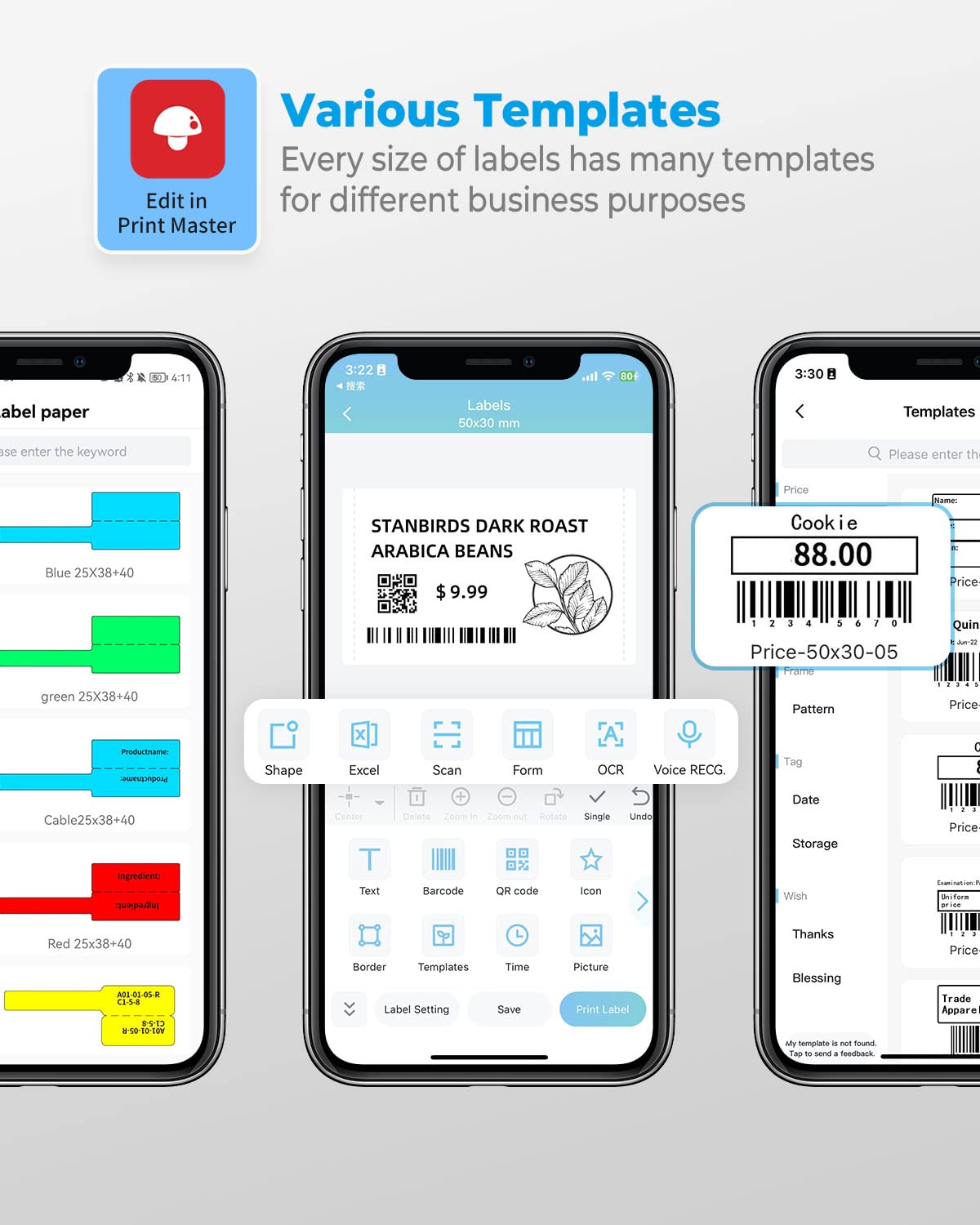 - [Simple but Powerful App]Connect via Bluetooth, edit and set print on your phone. Use Print Master app, it provides all free ready-to-use label templates for all purposes above to boost your efficiency. You can also set up and save your own templates. 30+ fonts, 500+ emojis, 40+ borders are provided for custom label designs.