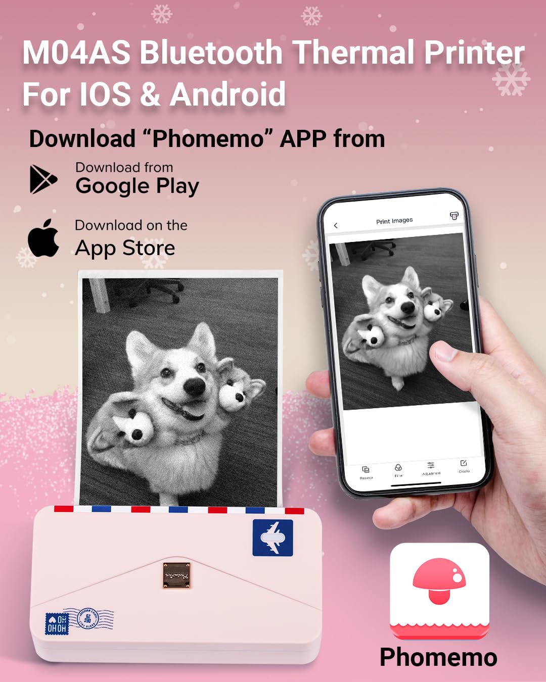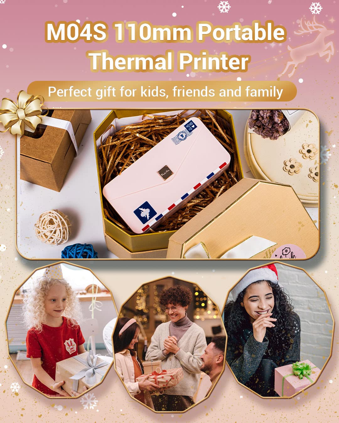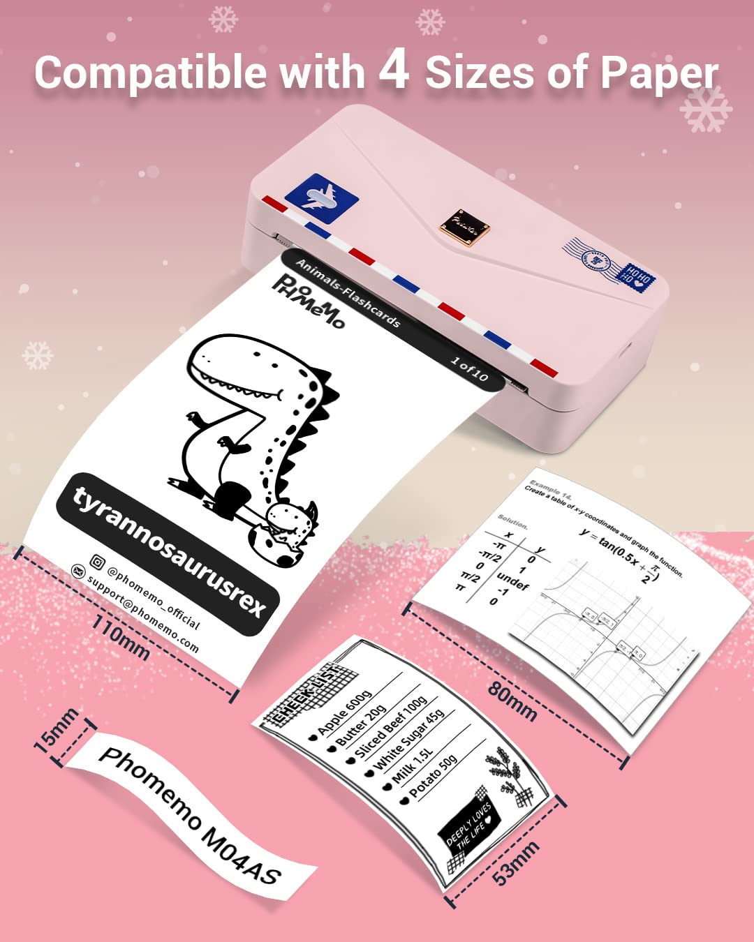 Phomemo Mini Yazıcı - M04AS 4'' Bluetooth yazıcısı mobil termal cep yazıcısı 15/53/80/110mm, 304dpi iOS&Android ile uyumlu, belgeler, fotoğraflar, notlar, etiketler, çıkartmalar için (Pembe)