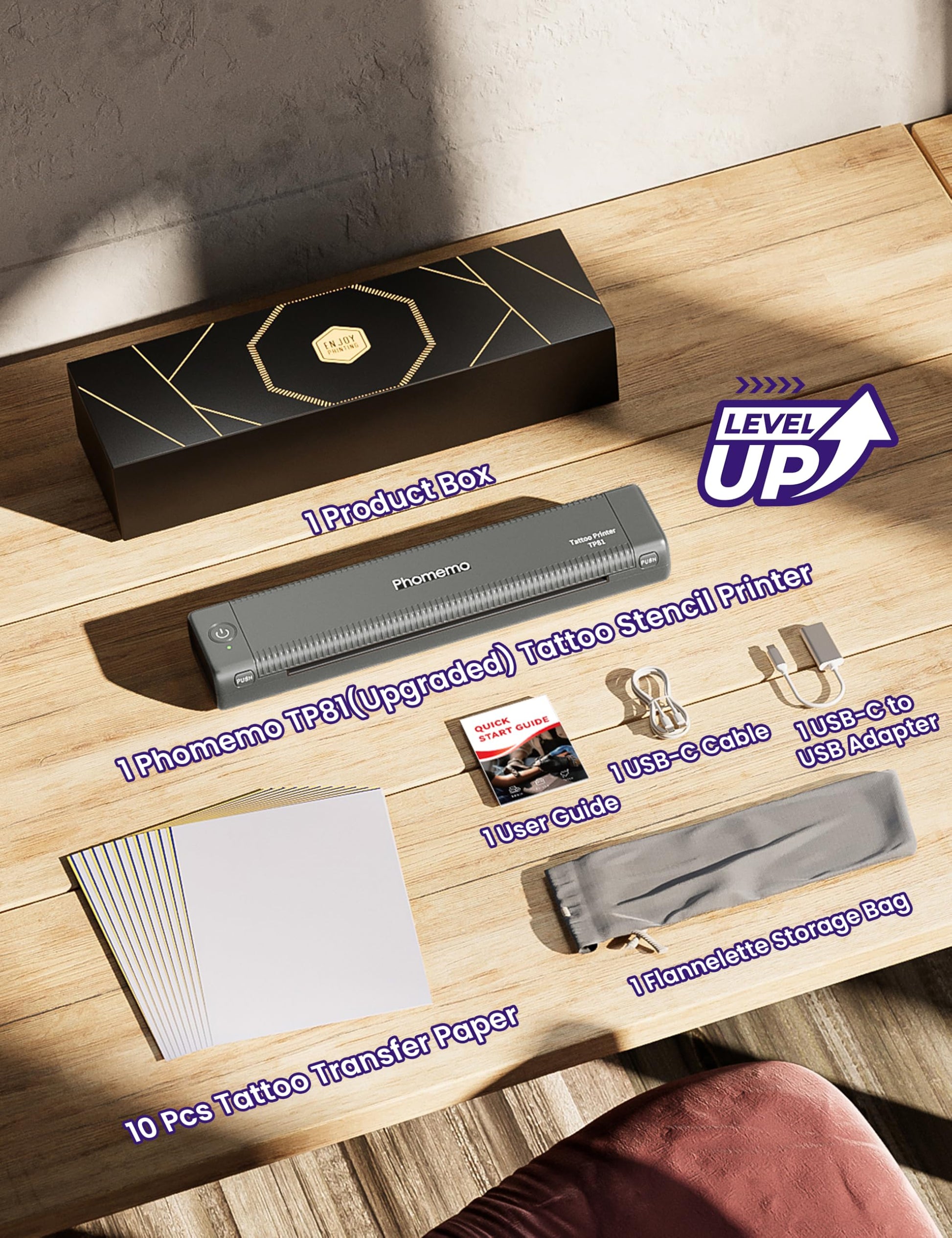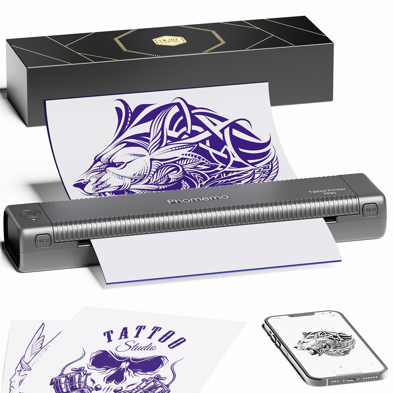 - 2024 Newly Launched Tattoo Stencil Printer¡ª¡ªThe Phomemo TP81 is designed for tattoo artists & beginners.This stencil printer is lightweight and portable while utilizing advanced inkless thermal technology to produce crisp, clear prints without the worry of clogging or cleaning. In addition, Anti-wrinkle function is the biggest upgrade. TP81 tattoo machine is packaged in a gift box with gold foil stamping on the surface to emphasize the premium quality of Phomemo. (Note: This tattoo printer is specifically designed to print simple and clear one-color patterns)
