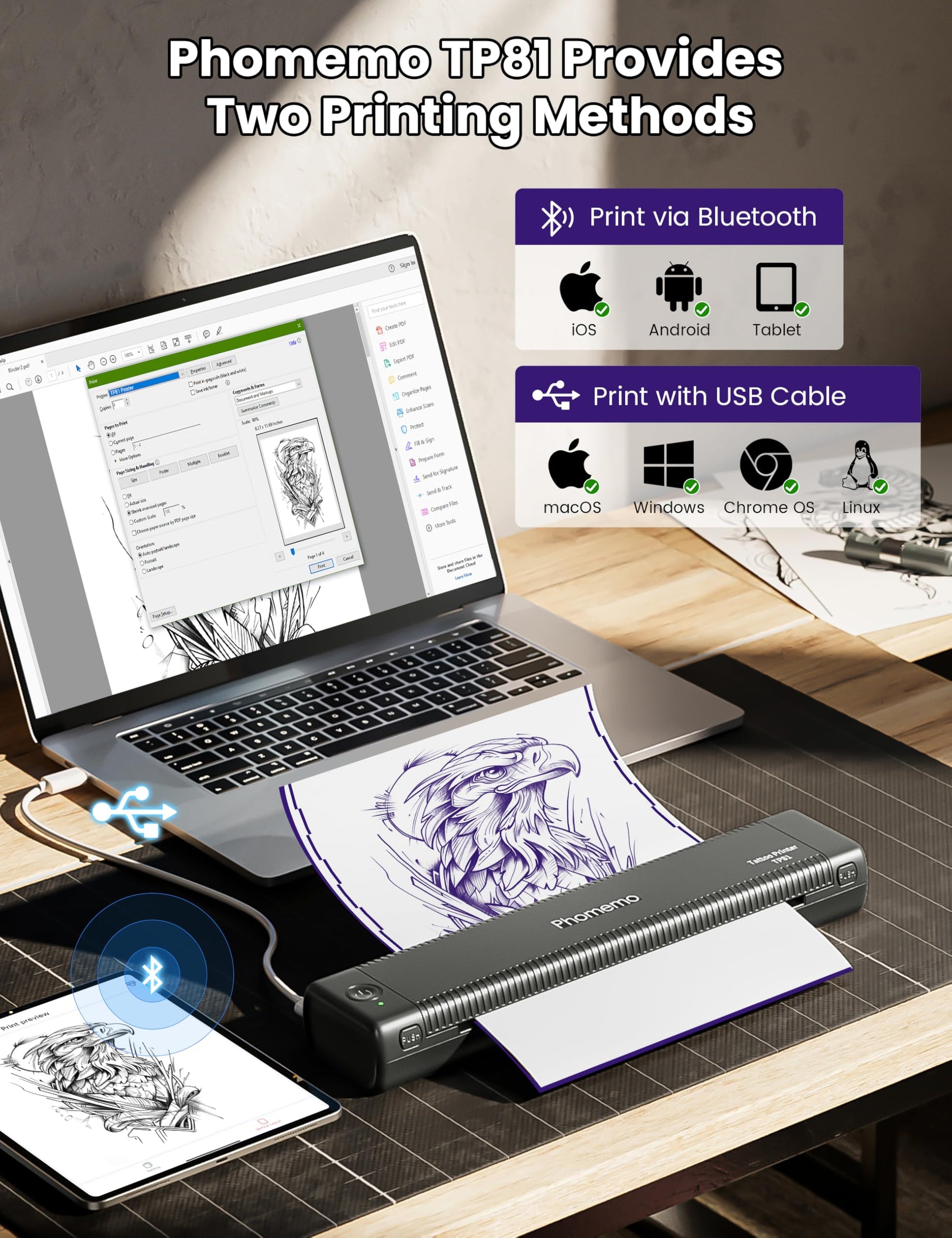 - Bluetooth Tattoo Printer with High Compatibility¡ª¡ªPhomemo tattoo stencil printer is compatible with both smartphones and laptops. Phones and tablets support Bluetooth connectivity, laptops must be connected via a USB Type-C cable.This tattoo transfer machine also supports a wide range of operating systems, including Android, iOS, Windows 7 or above, macOS 10 or above. (Note: Using laptop you must go to tp81.phomemo.com to download the driver in order to print)