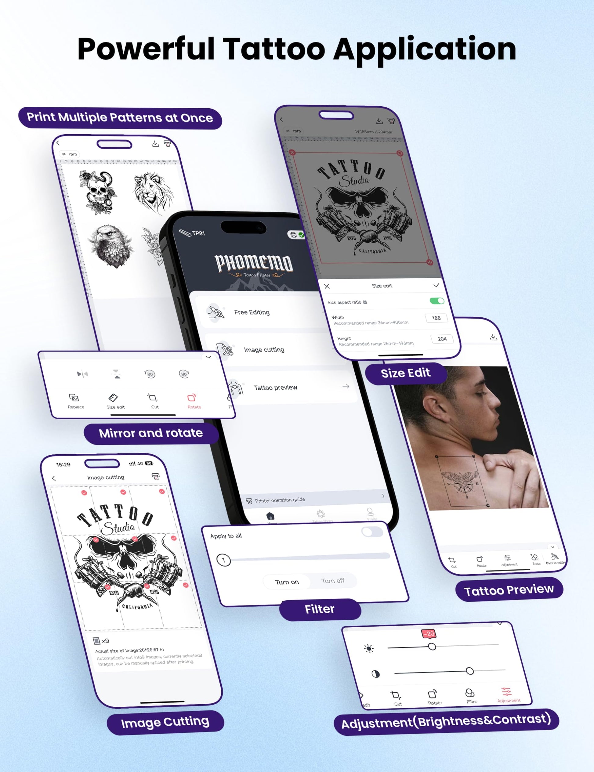 - Tattoo Transfer Machine with Powerful APP¡ª¡ªThe Phomemo APP will bring you a unique experience. Popular tattoo totems are provided in the APP, along with free editing and large image cutting & printing functions. Free editing function allows you to select 1-4 tattoos for stitching, and you can manually adjust the size, orientation and layout. If you choose a large tattoo, you can choose to have the design cut into 2-9 equal parts for printing.In addition, Phomemo APP also provides tattoo preview function, you can clearly see the actual effect before printing! (Note: For best printing results, we recommend using Phomemo tattoo transfer paper)