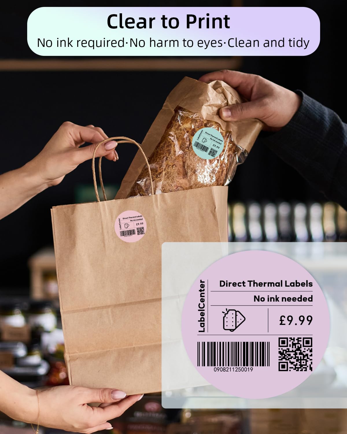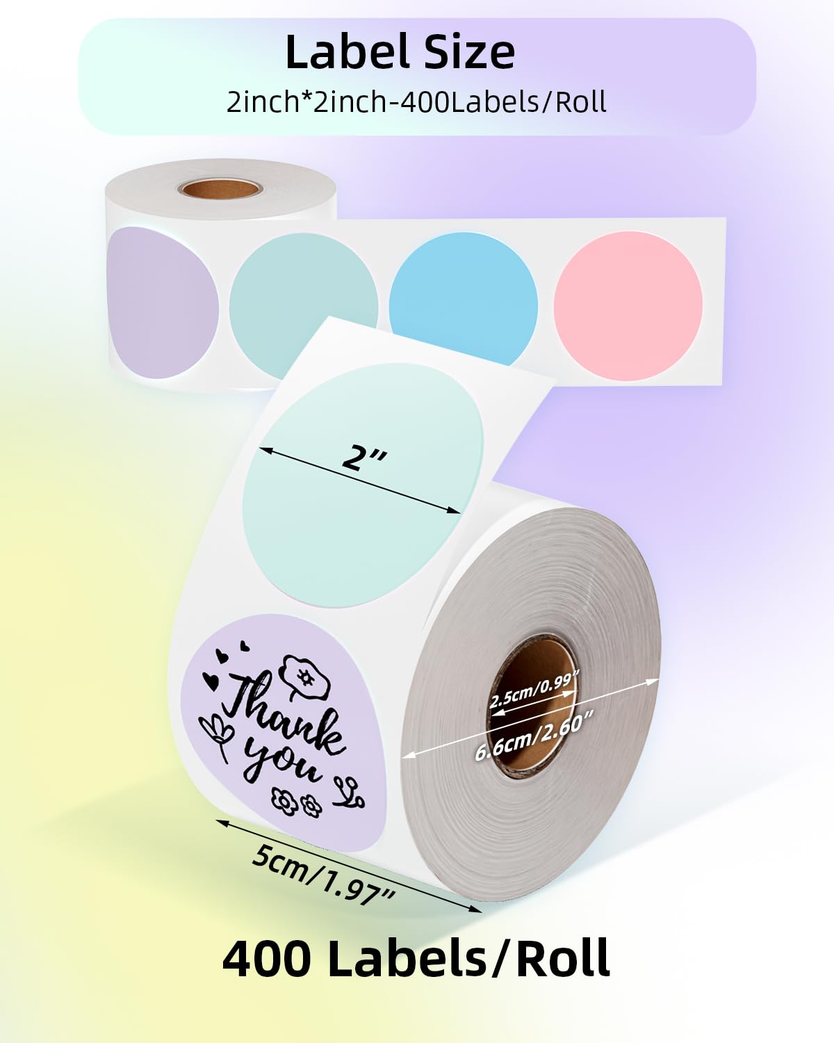 Phomemo Okr?g?e etykiety termiczne, samoprzylepne, okr?g?e, bezpo?rednie etykiety termiczne z podzi?kowaniami, logo, imi? i nazwisko/cena, adres, kod QR, 400 etykiet (fioletowy, zielony, niebieski,