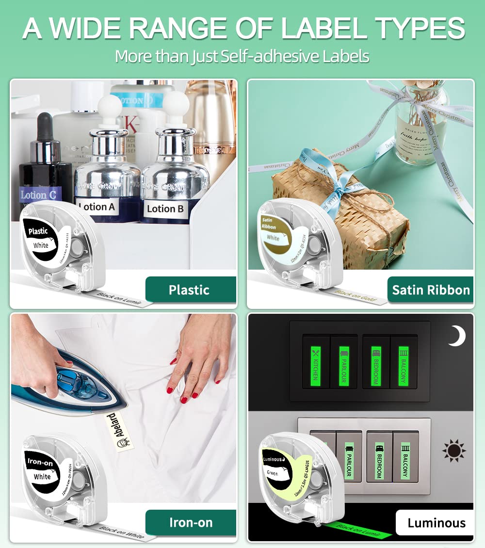 - Hunderte von P12-Etikettenbändern: Dieses beschriftungsgerät bluetooth druckt auf dem P12 etikettenband, das in einer breiten Palette von Farben und Materialien erhältlich ist. Es gibt nicht nur selbstklebendes Etikettenpapier und Kunststoffetiketten in verschiedenen Farben, sondern auch satinbänder zur Christmas dekoration und Stoffbügeletiketten für Kleidung (einschließlich der beliebtesten transparent und schwarze etiketten)