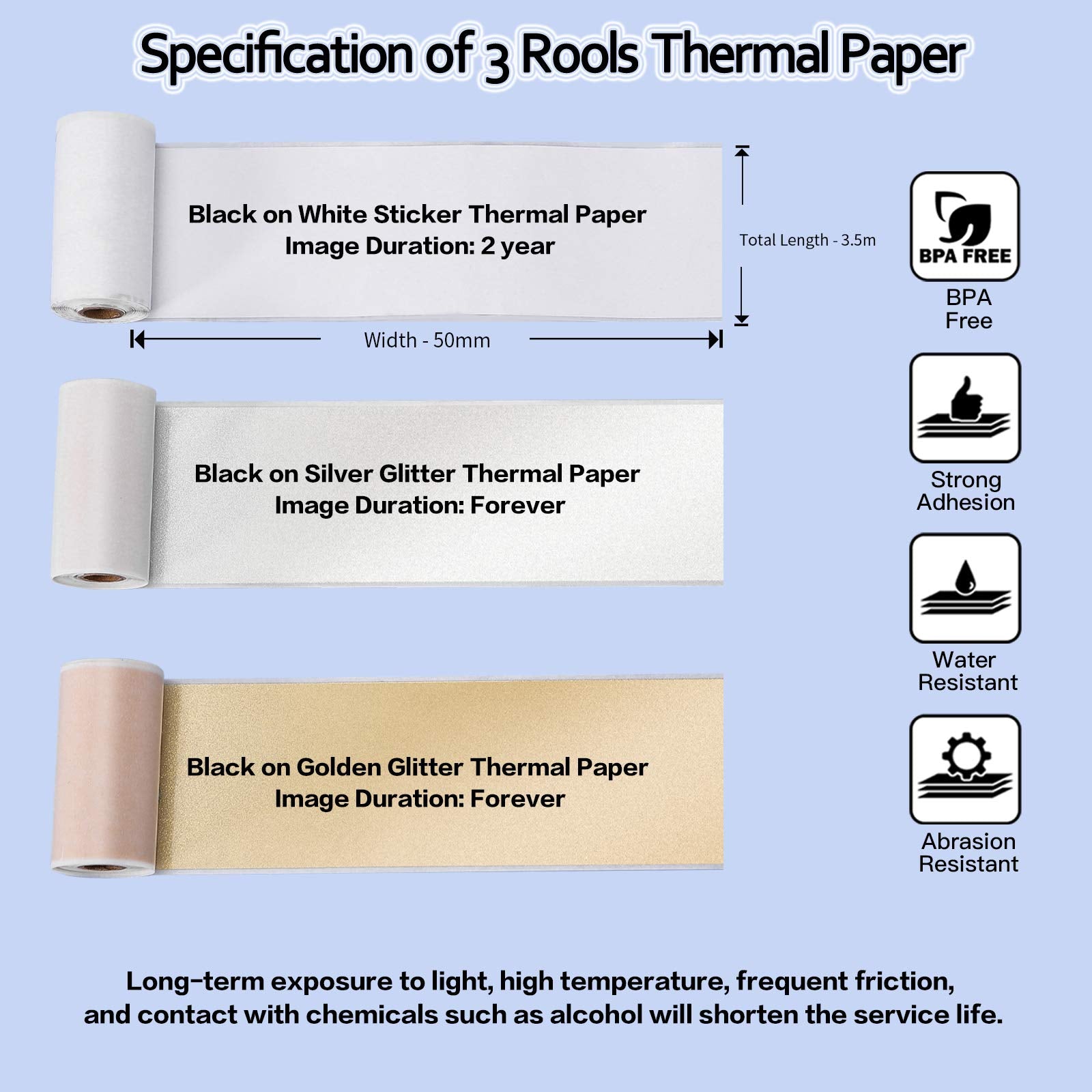 Phomemo Papel - M02/M02Pro/M02S/M03/M03AS/M04S/M04AS Mini Pegatinas Impresora Papel, Blanco/Plata Brillante/Golden Glitter Mini Pocket Thermal Pinter Papel adhesivo Pin, 3 rollos