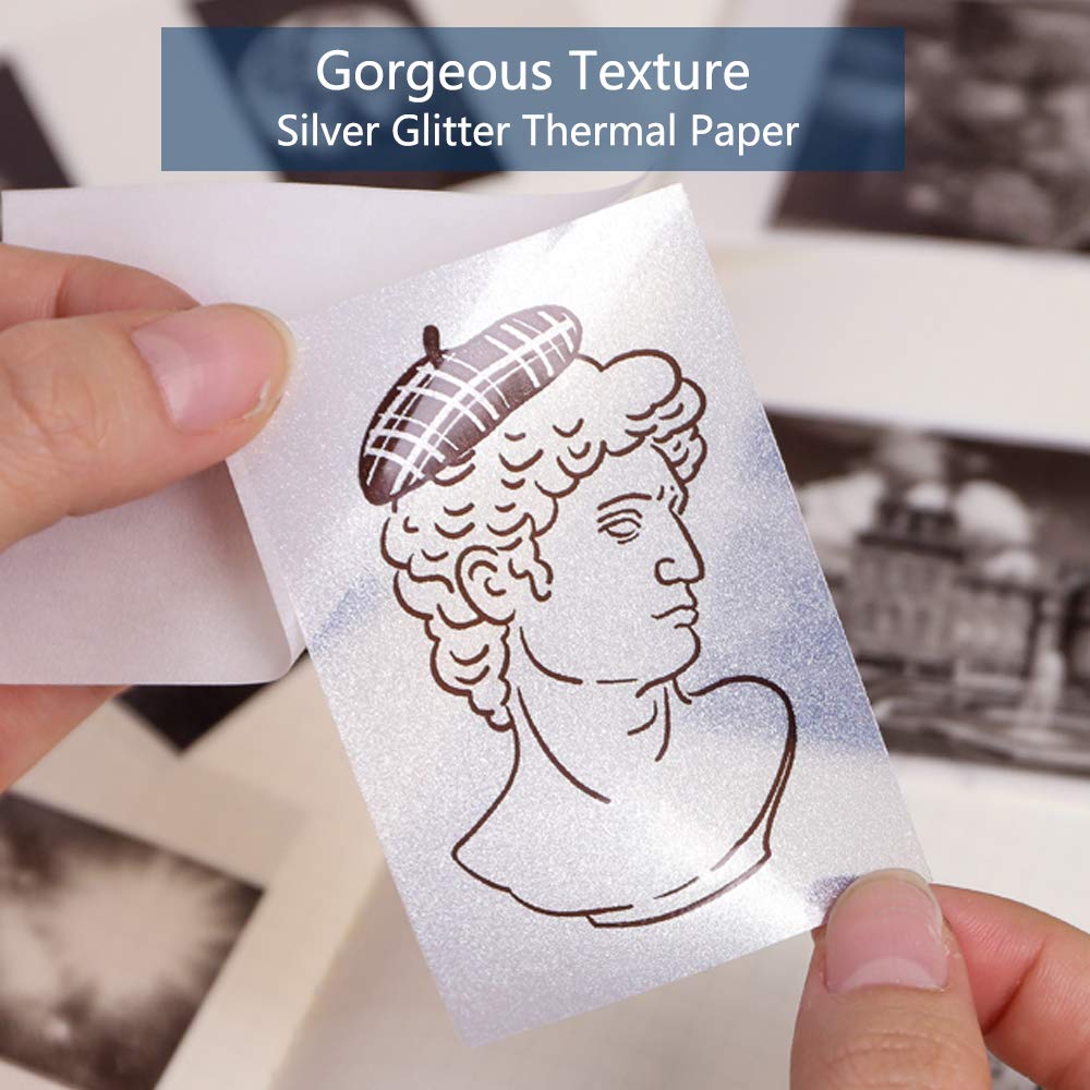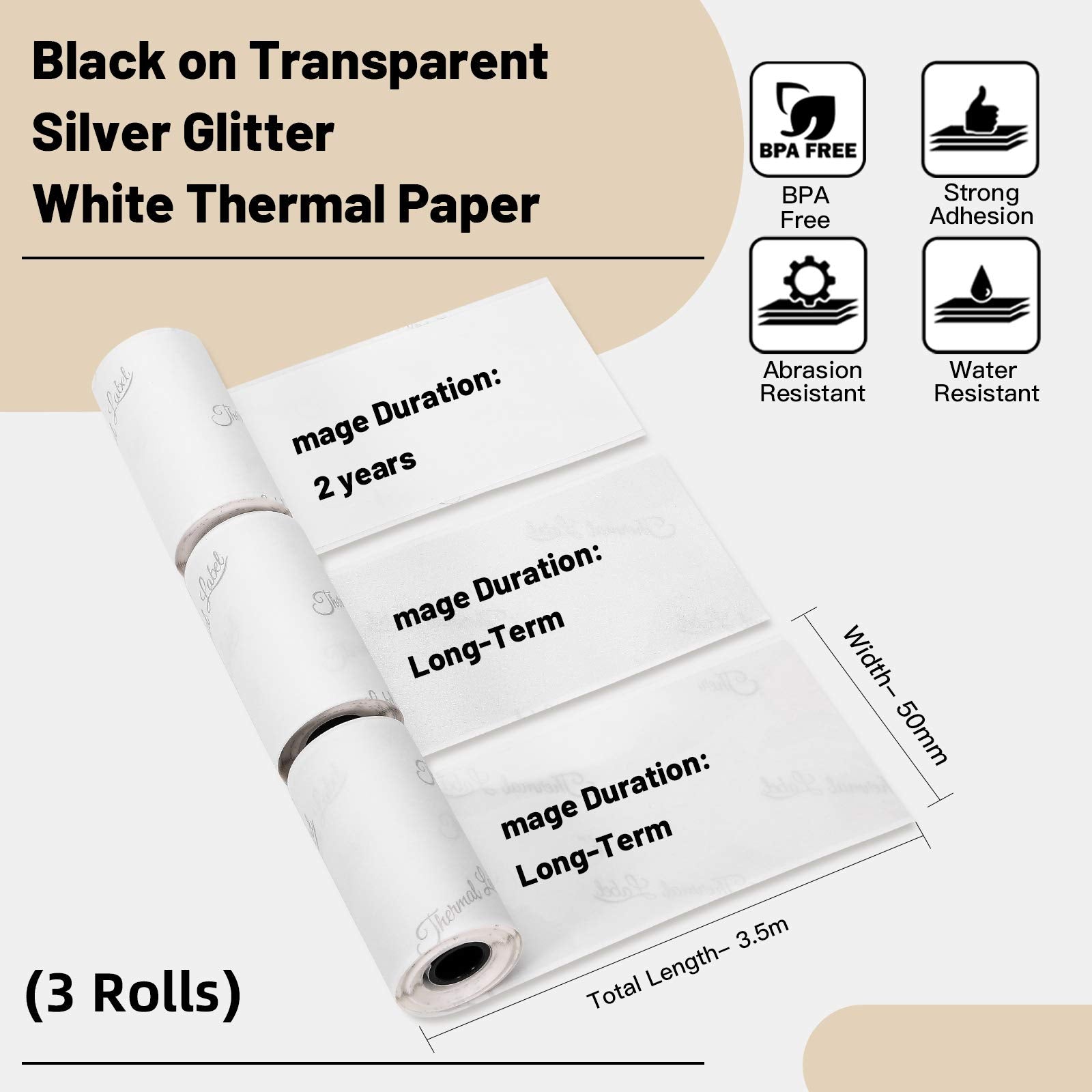 Phomemo Papel M02/M02Pro/M02S/M03/M03AS/M04S/M04AS, Papel T¨¦rmico, Set de Papel Blanco Transparente/Plateado Glitter, Papel Adhesivo Imprimible, 3 Rollos
