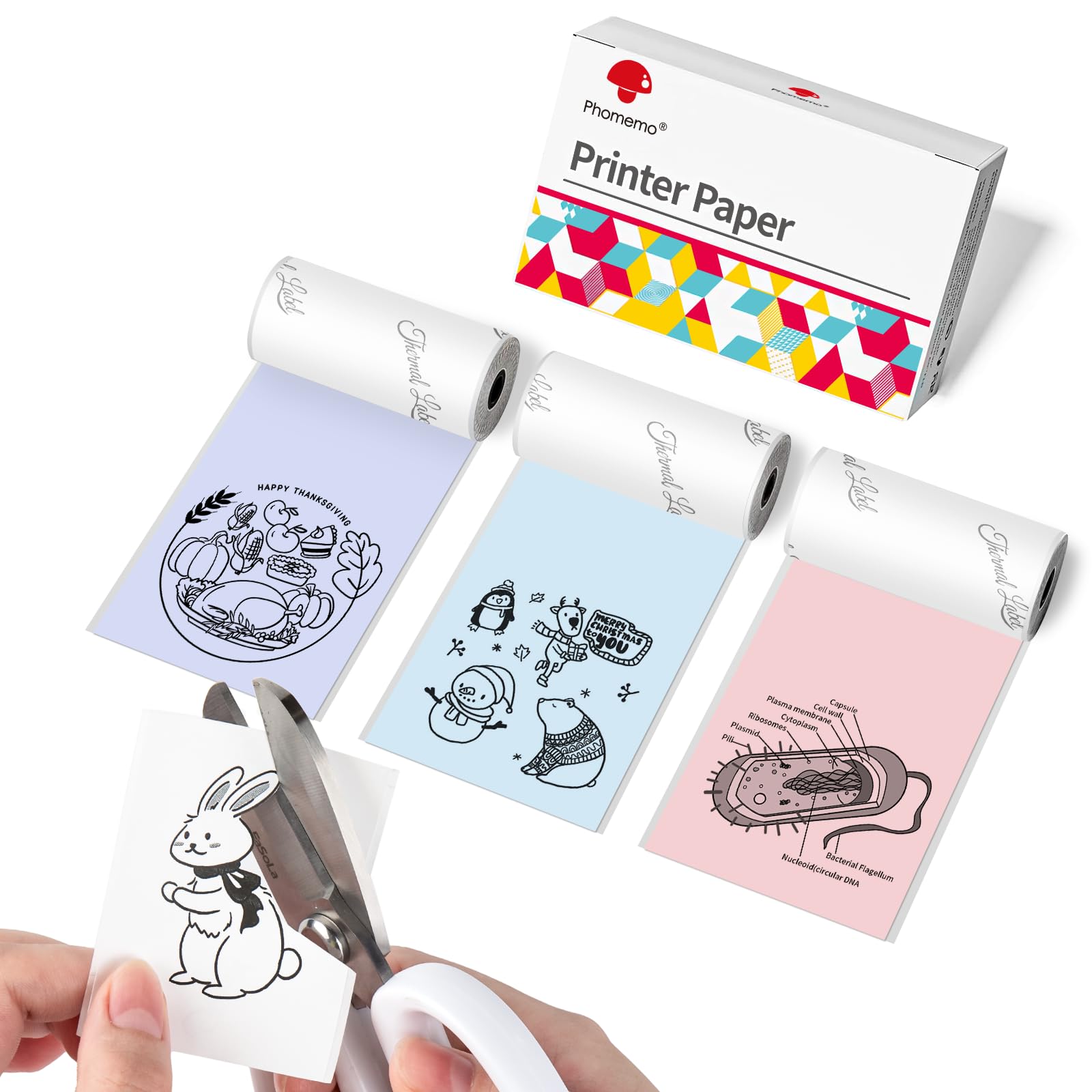- Lo que obtienes: 3 rollos de papel adhesivo multicolor. Rosa claro, violeta claro, azul claro. Impresiones en blanco y negro. El contenido impreso se puede guardar durante 20 a?os.