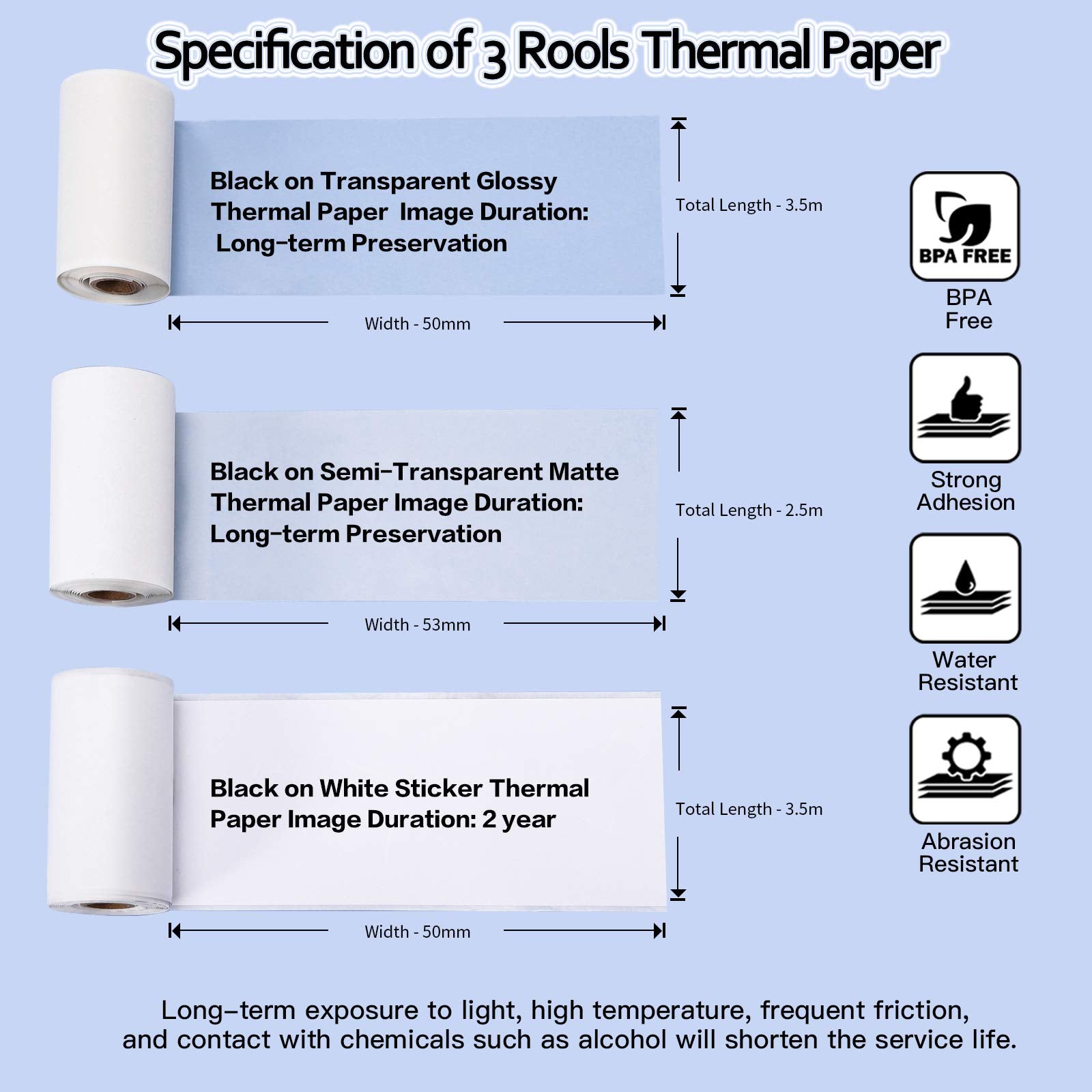 Phomemo Papier - M02/M02Pro/M02S/M03/M03AS/M04S/M04AS Mini naklejka do drukarki, bia?y/p¨®?przezroczysty/przezroczysty papier termiczny do samoprzylepnej naklejki papier, 3 rolki