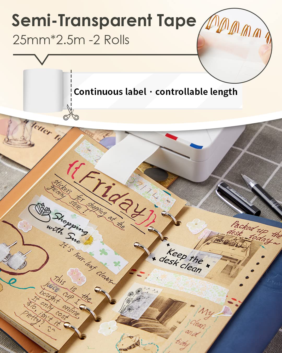 - Ruban d'étiquettes semi-transparent: 25 mm x 2,5 m (2 rouleaux). Matériau mat avec semi transparent