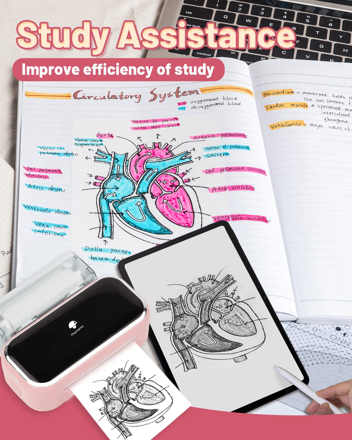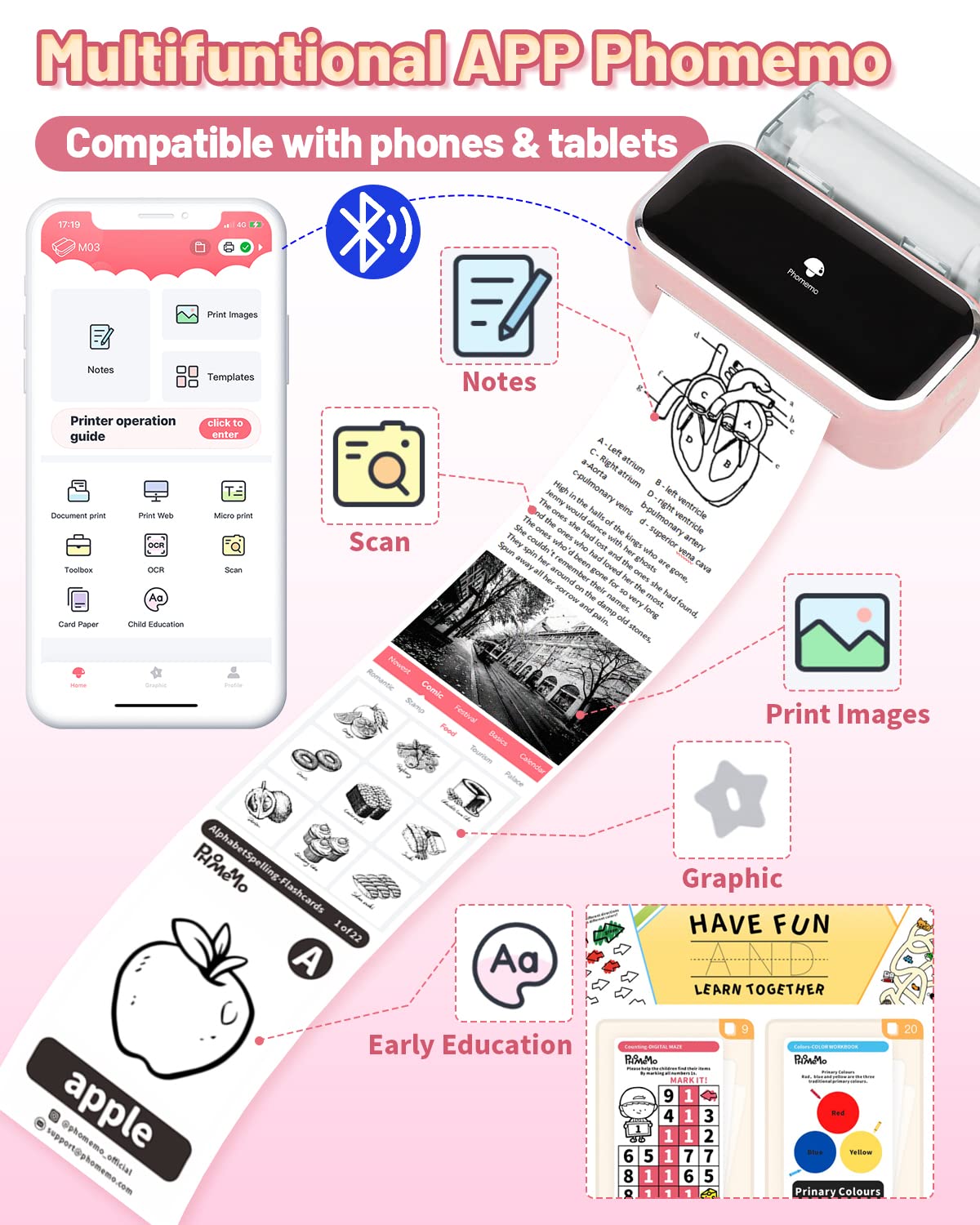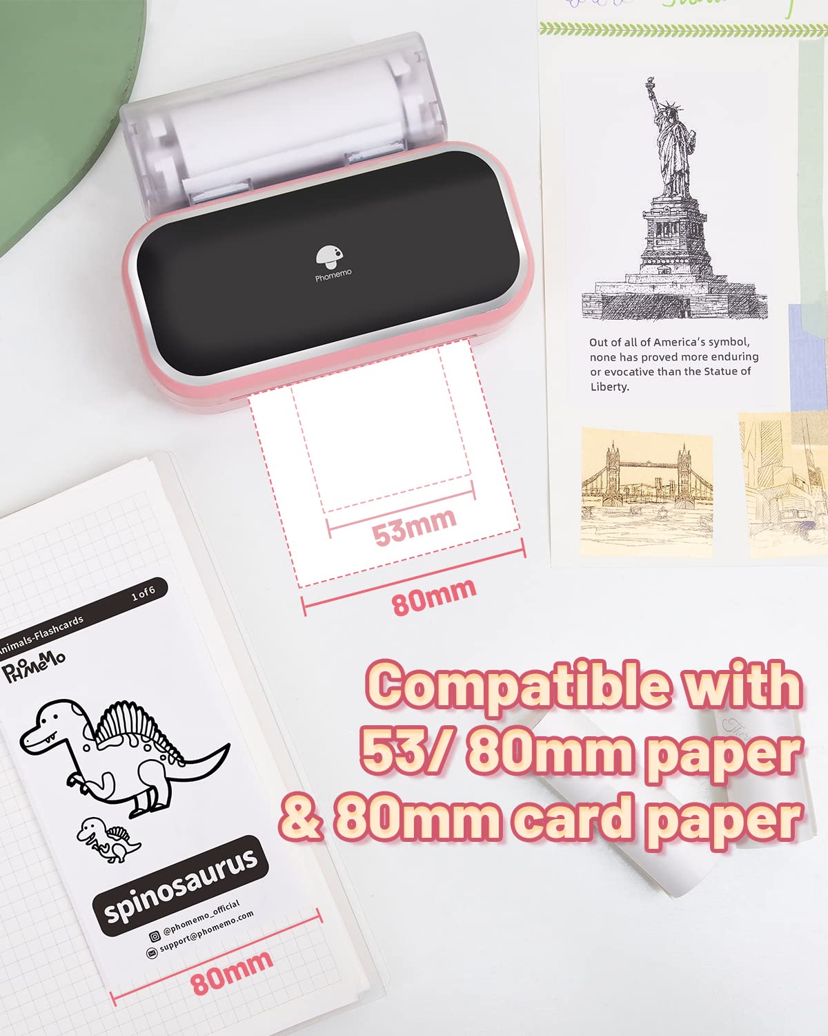 - 3 inch Printing: The Phomemo M03 portable printer is a black and white photo printer. Compatible with paper widths of 53 mm and 80 mm. Ideal for students to print study notes, to-do lists, patterns, labels stickers and more