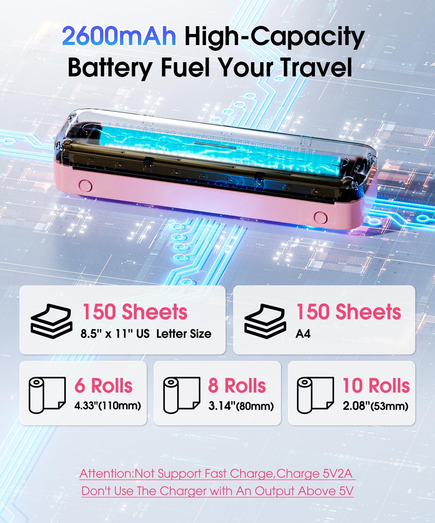 - Rechargeable & On The Go Printer - The M832 printer is compact , portable and lightweight, built-in 2600mAh rechargeable battery ,weighing only 700g and come with 1 storage case, making the thermal portable printer wireless ideal for on the go use. The inkless Bluetooth printer full charged could keep printing 150 sheets 8.5'' x 11'' Letter size paper, suitable for travel, office, home to use