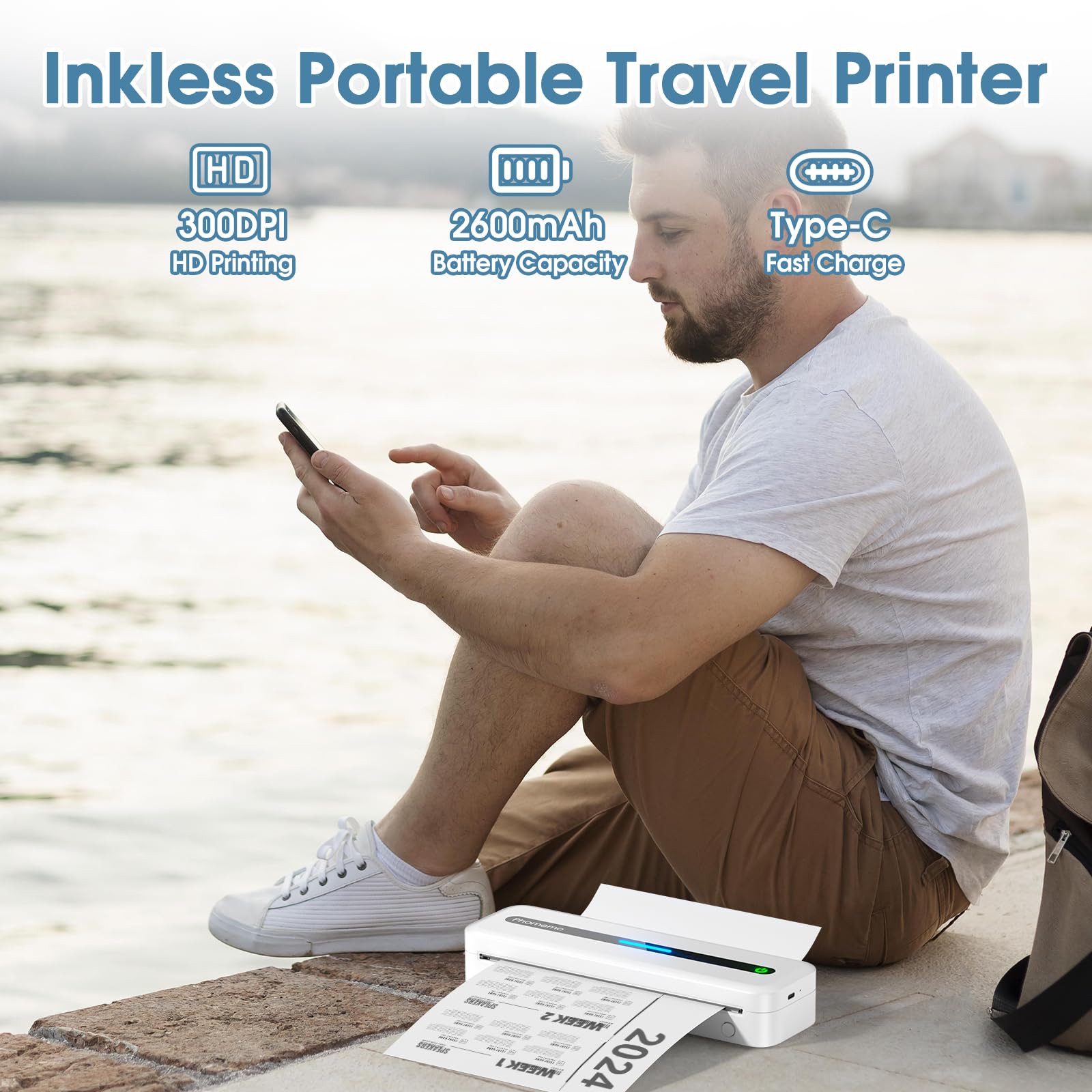 - 300DPI Travel Printer: The compact printer is designed with high-definition printing technology, providing you with 300 DPI clear printing. And built-in 2600mAh rechargeable battery, mini printer can print up to 150 sheets on a full charge, must be a good travel partner