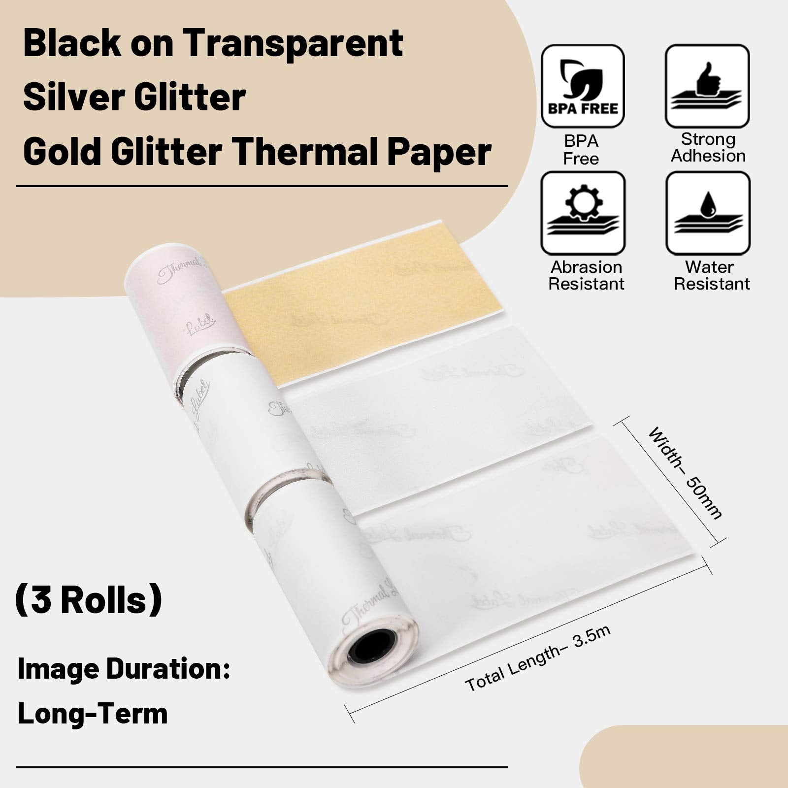 Phomemo Printer Paper - M02/M02Pro/M02S/M03/M03AS/M04S/M04AS Sticker Printer Paper, Transparent/Silver Glitter/Golden Glitter Pocket Printer Paper Self Adhesive Sticker Paper, 3 Rolls