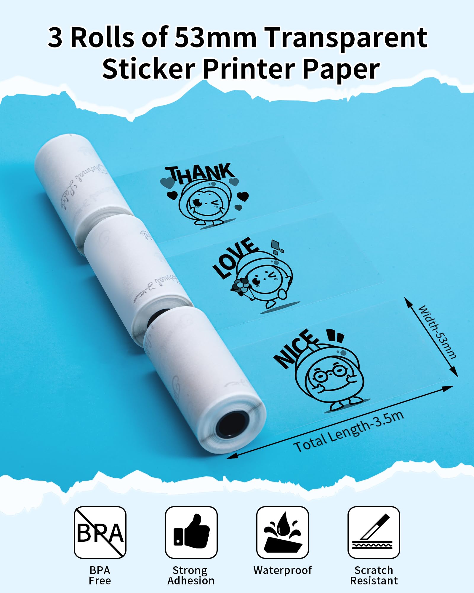 Phomemo Przezroczysty papier do Phomemo M02PRO, T02, M02, M02S, M03, M03AS, M04S, M04AS mini drukarka do smartfonów, 53 mm x 3,5 m, 3 rolki