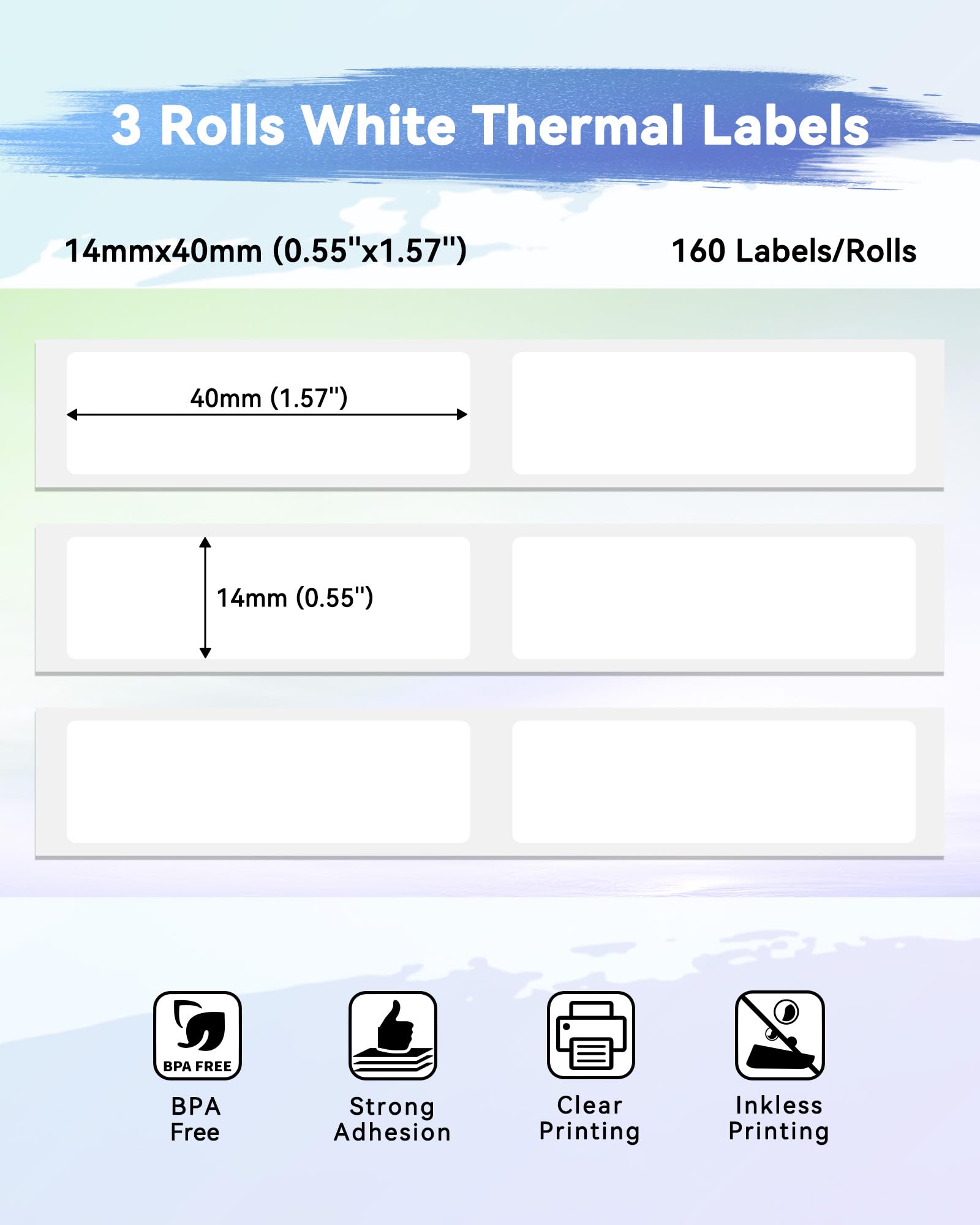 - [Vous obtiendrez] - 3 rouleaux d'étiquettes thermiques autocollantes blanches, 160 étiquettes par rouleau. Les dimensions sont : 14x40mm (0,55'' X 1,57''). Impression en noir et blanc. Ils sont imperméables, résistants à l'abrasion et sans BPA.