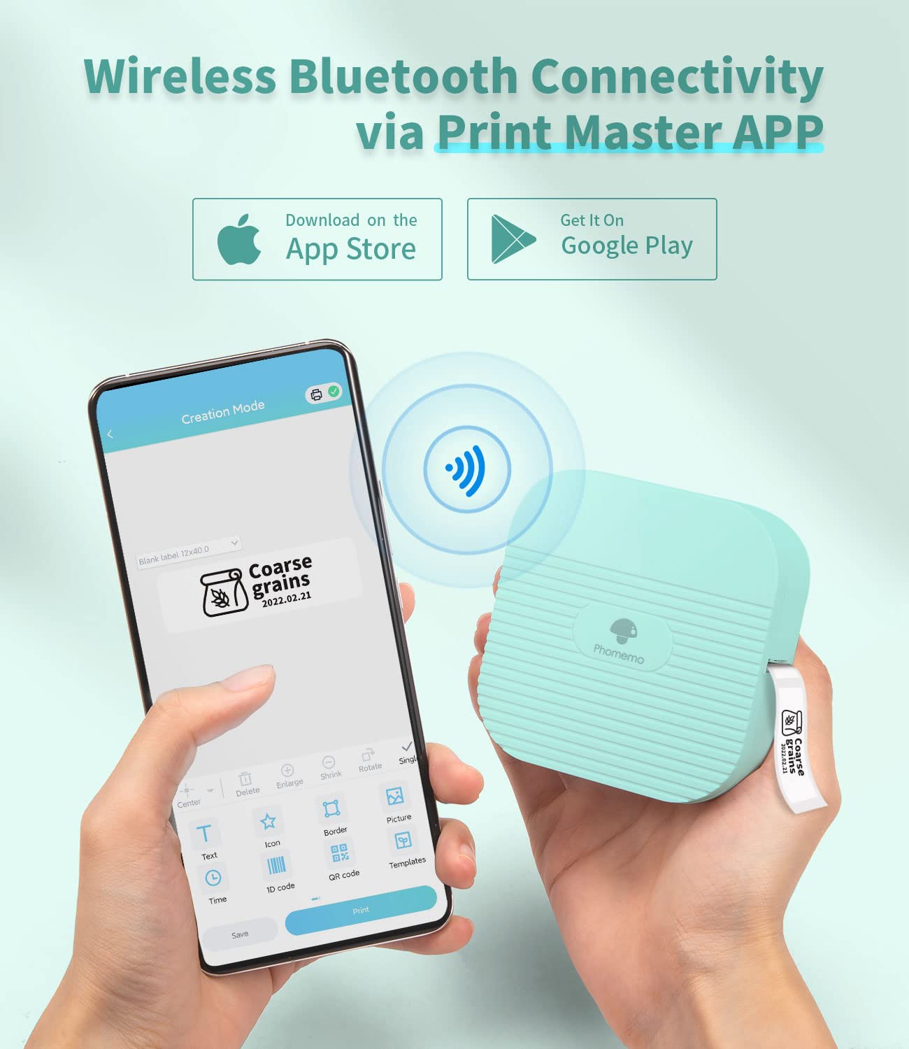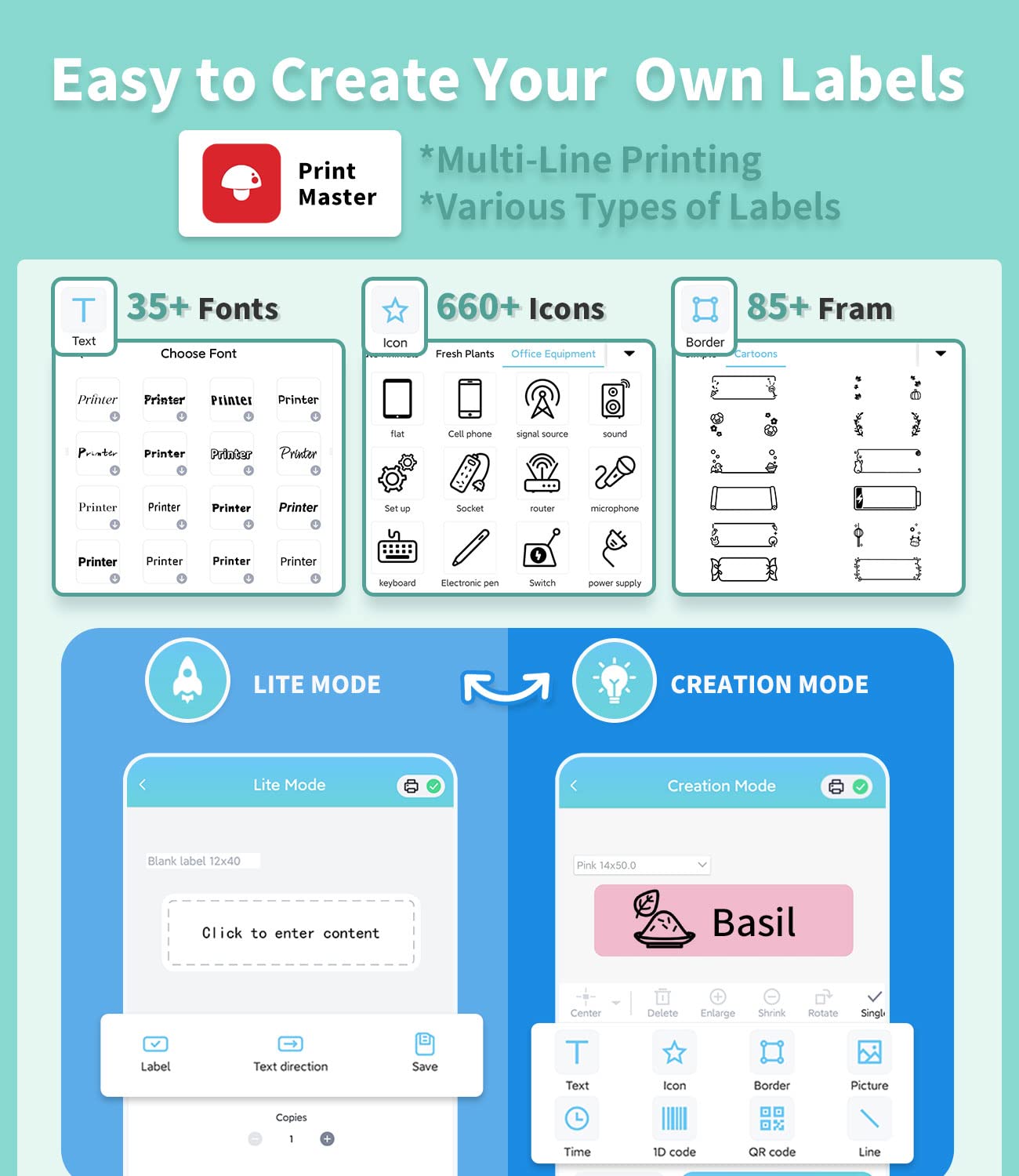 - Convenient Label Editing:Edit on phone via app ''Print Master'', providing more possibilities and convenience vs. traditional keyboards. Various fonts and icons are available to achieve ideal effects. It takes only few minutes to customize your own labels and you could save labels for later re-use