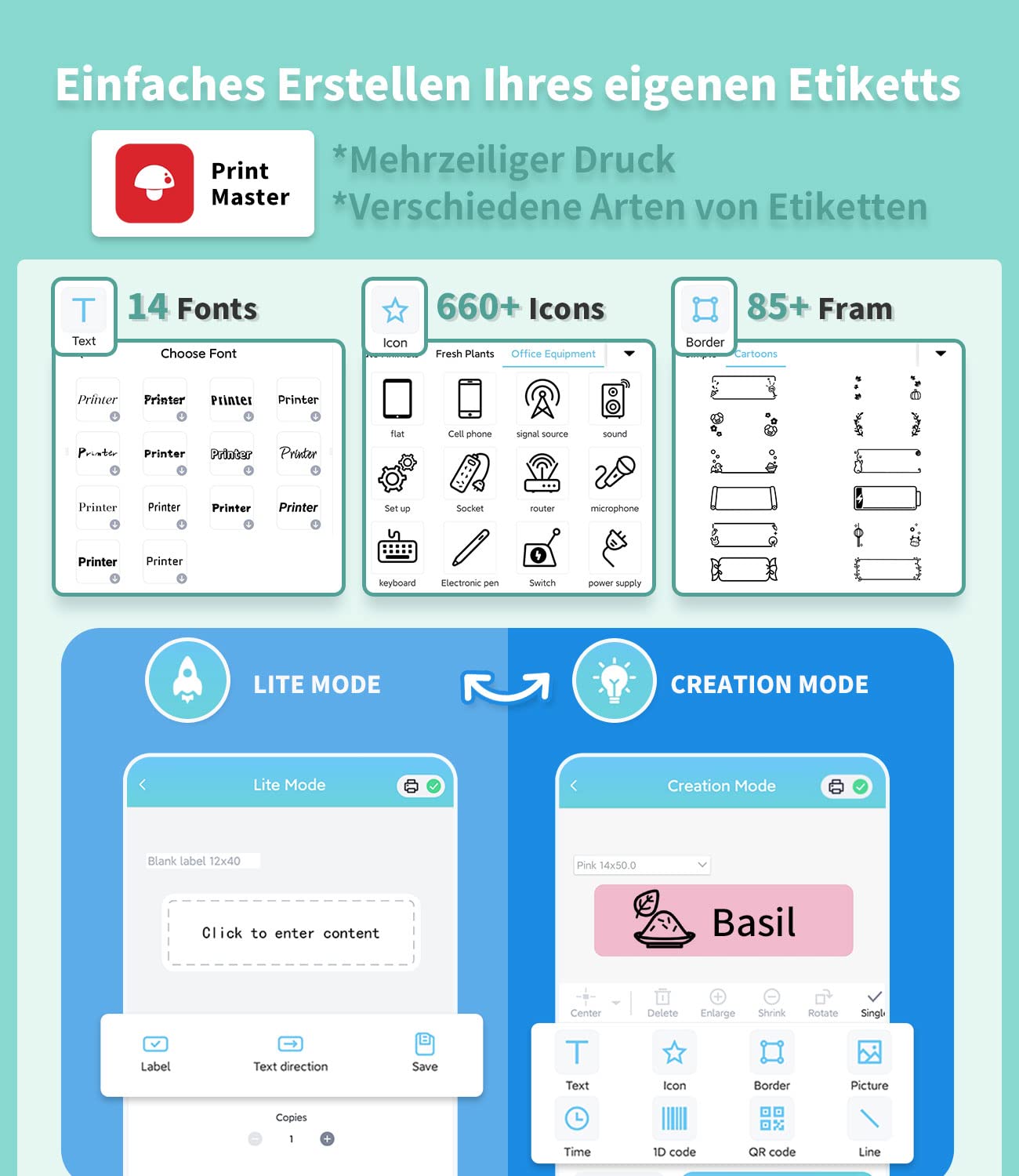 - Bequeme Bearbeitung von Etiketten: Die Bearbeitung auf dem Telefon über die App ''Print Master'' bietet mehr Möglichkeiten und Komfort als herkömmliche Tastaturen. Es stehen verschiedene Schriftarten und Symbole zur Verfügung, um ideale Effekte zu erzielen. Es dauert nur wenige Minuten, um Ihre eigenen Etiketten zu gestalten, und Sie können Etiketten zur späteren Wiederverwendung speichern