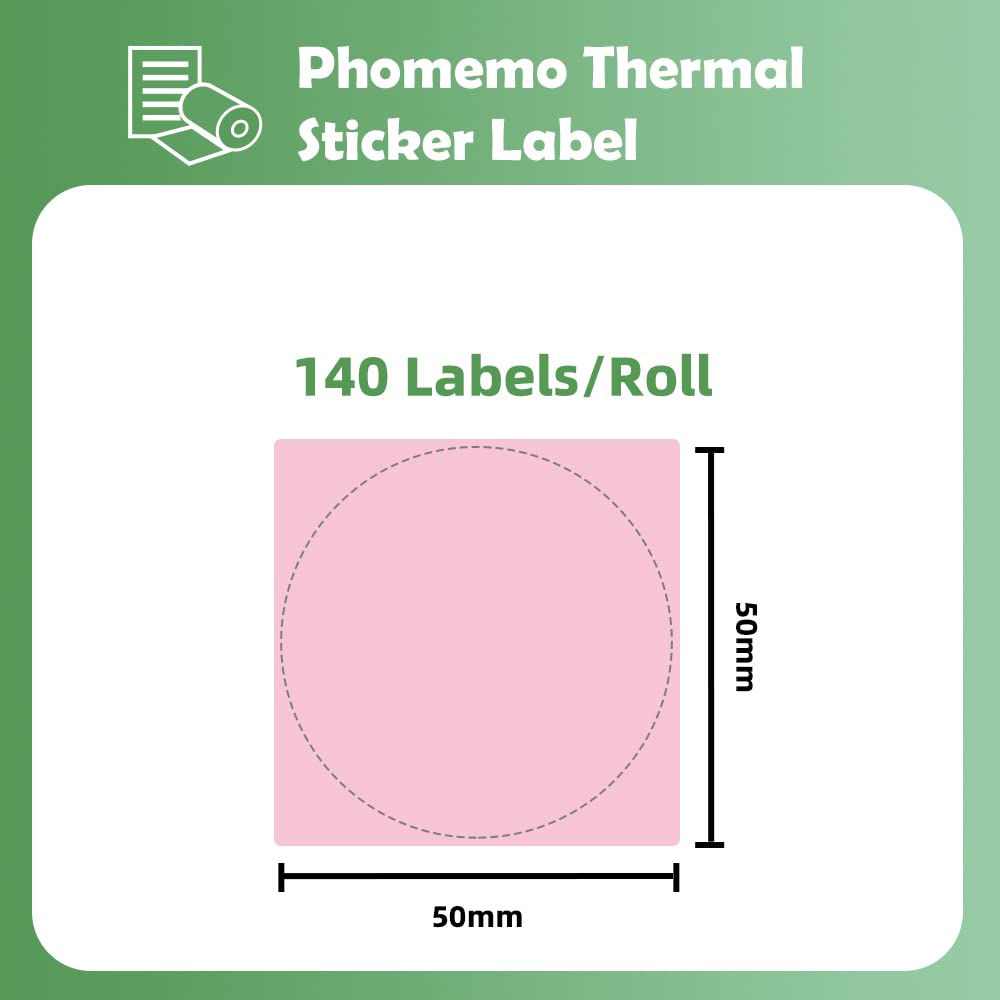 Phomemo Round Circle Label Label Machine M110 M120 M200 M220 M221 Thermal Printer Labels for Price Name Address Logo Barcode 50x50mm Pink (1 Roll)