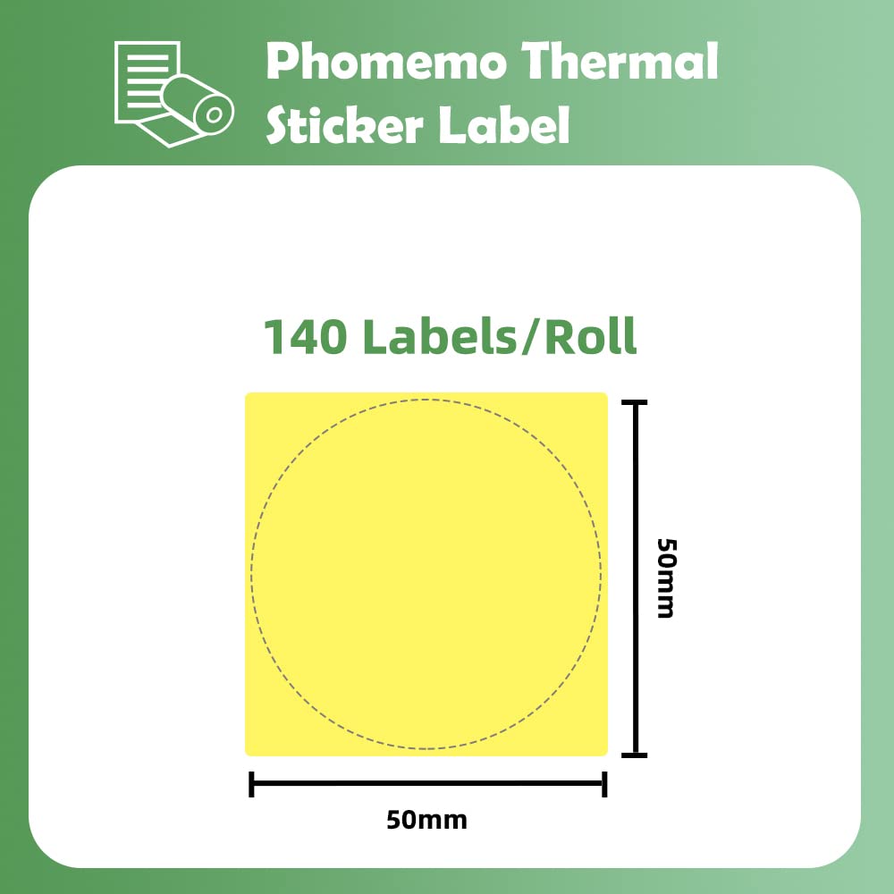 Phomemo Round Circle Label Label Machine M110 M120 M200 M220 M221 Thermal Printer Labels for Price Name Address Logo Barcode 50x50mm Yellow (1 Roll)