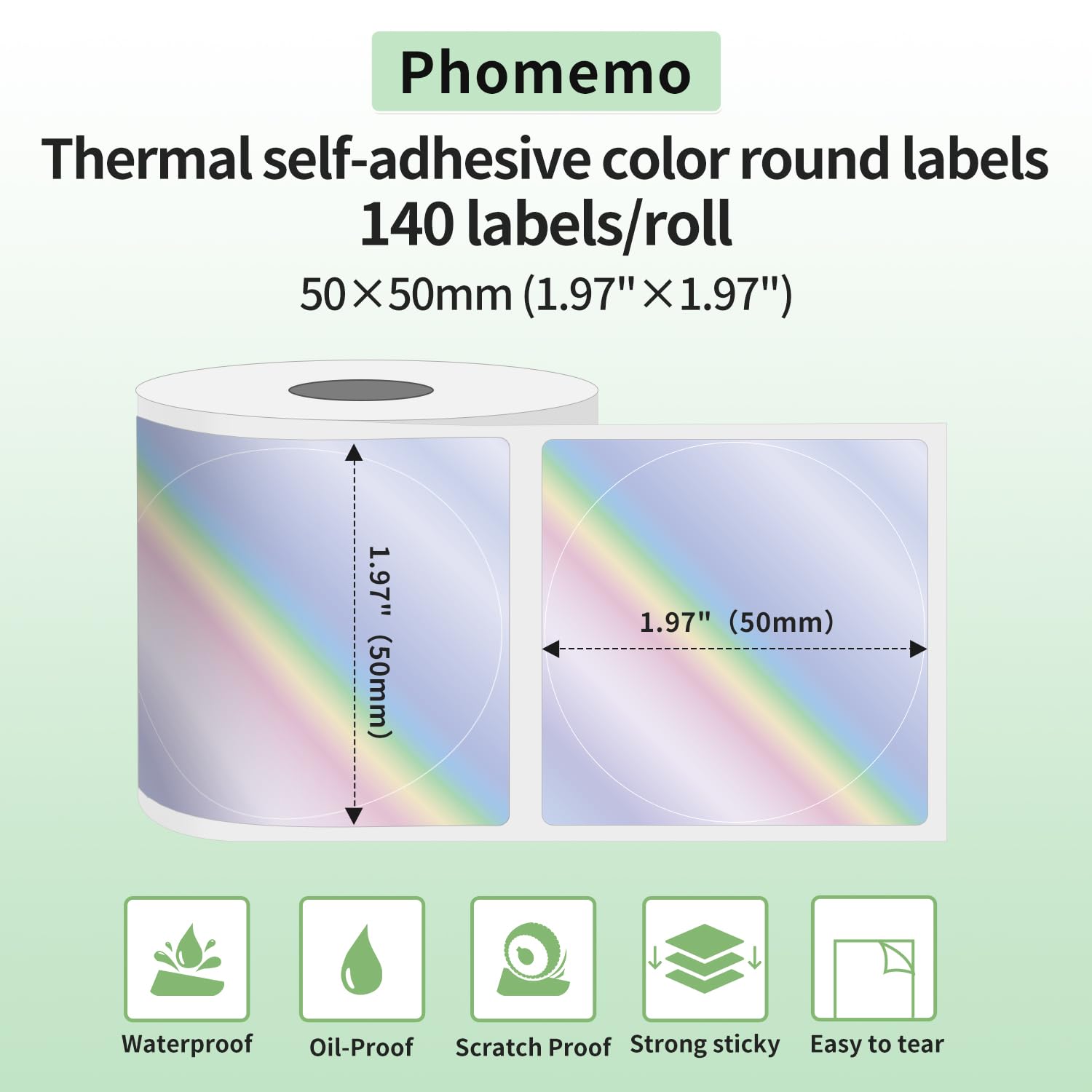 • Thermo-Etiketten Spezifikationen - Phomemo selbstklebende runde Laser-Etiketten mit Farbverlauf, Gr??e: 1,57'' x 1,57'' (50x50mm), 140 Etiketten/Rolle. Farbe: Farbverlauf Laser rund. Ideal f¨¹r Preisschilder, Barcodes/QR-Codes, DIY-Logo-Designs, Namensschilder, Preisschilder, Dankeskarten, Adressen, Branding-Designs und mehr