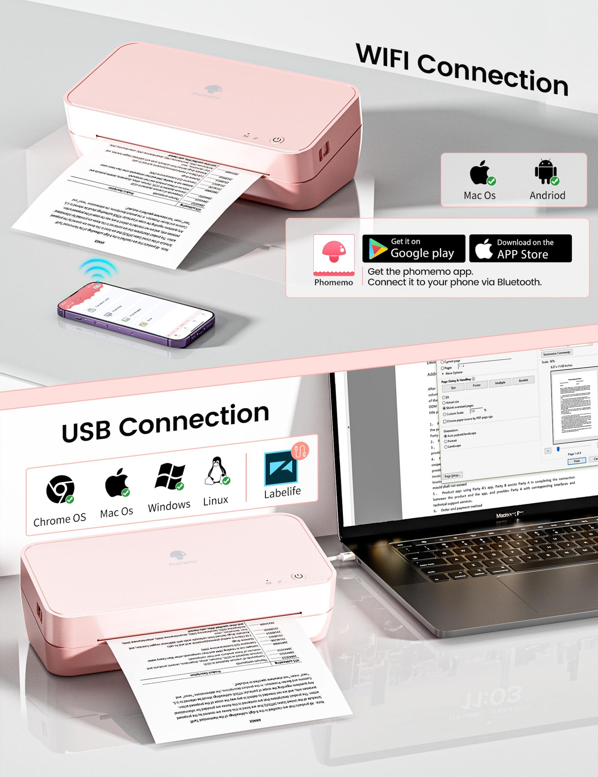 - [WiFi & USB]The Phomemo S821 thermal printer supports two types of connectivity. You can easily connect it to your cell phone via Wi-Fi and control the printer remotely from anywhere. In addition, you can also use a USB cable to connect to a computer for printing. (Note: 1. The computer only supports USB connection; 2. Wi-Fi connection is only compatible with 2.4 GHz network, not 5 GHz network).