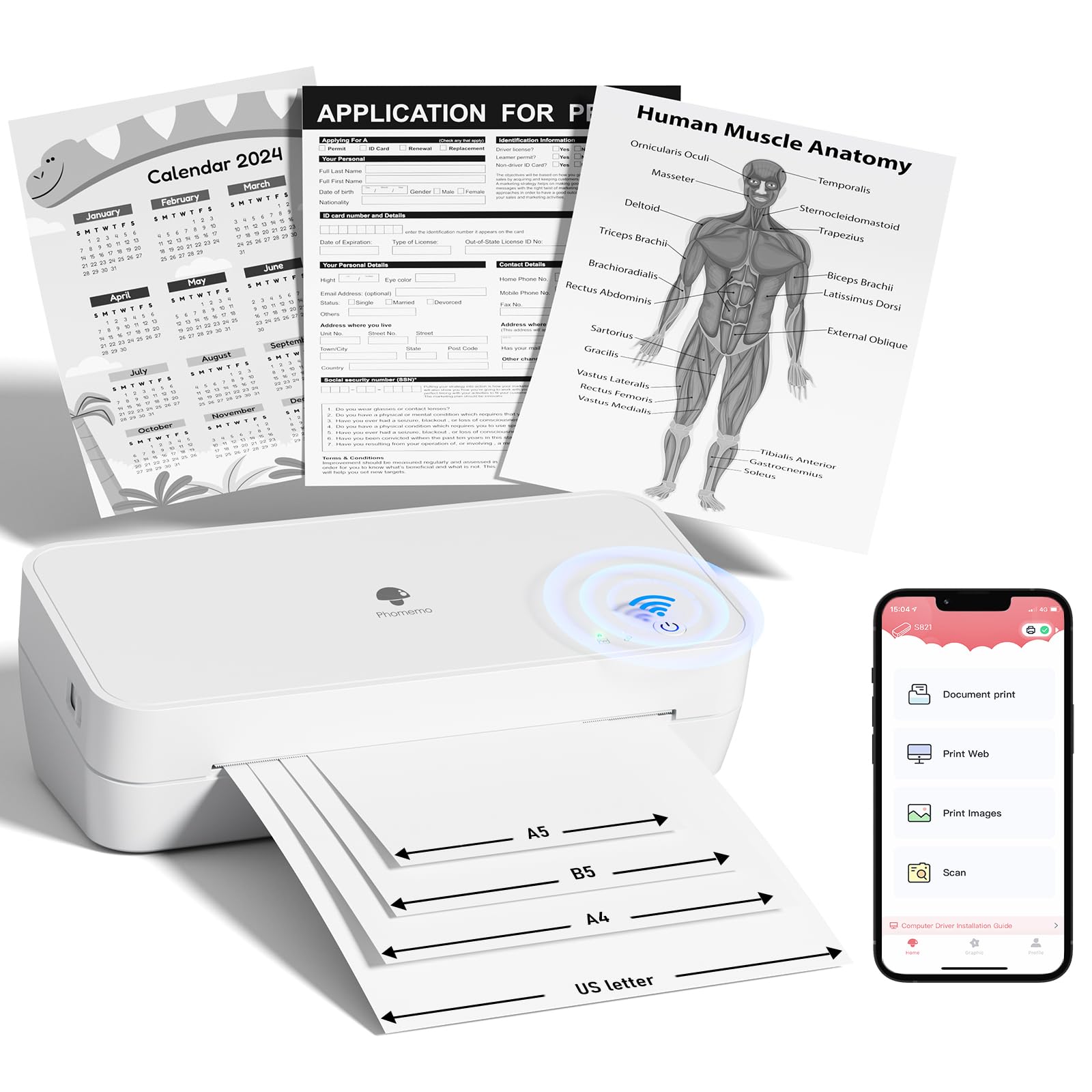 Phomemo S821 Thermal Printer, Inkless Printer Supports 8.5'' x 11'' US Letter & A4 Thermal Paper, Compact WiFi Printer Compatible with Android, iOS, Windows, Mac, 2.4 GHz, for Home Use, Office, School
