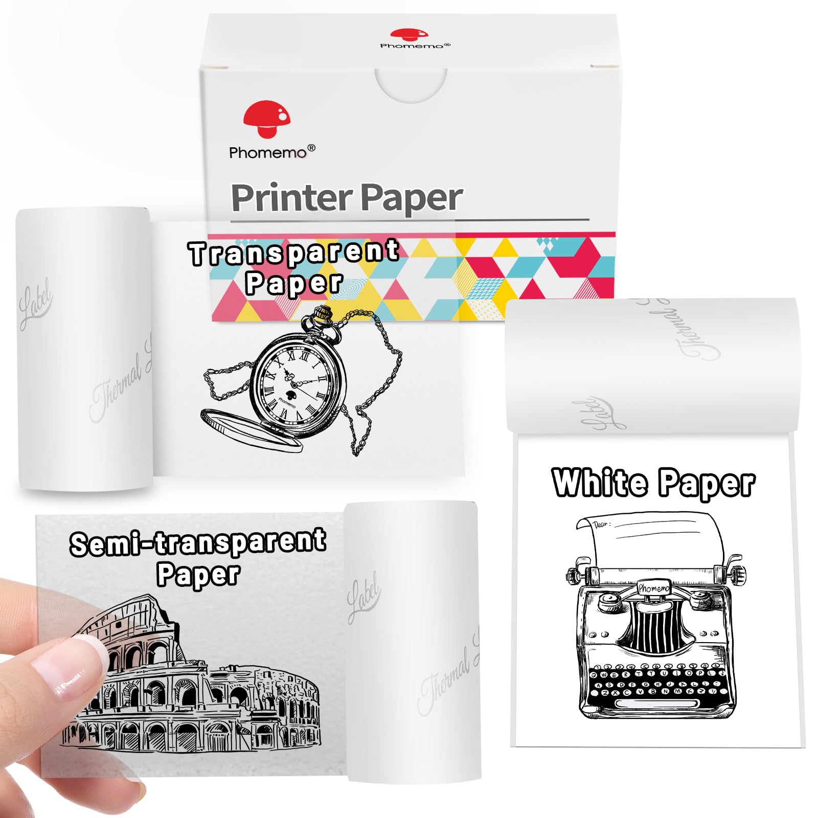 Phomemo Samoprzylepny papier termiczny do drukarki Phomemo M02/M02S/M02Pro/M03/M03AS/M04AS mini drukarka termiczna, 53 mm x 3,5 m, biały/przezroczysty/półprzezroczysty papier do drukarek, 3 rolki