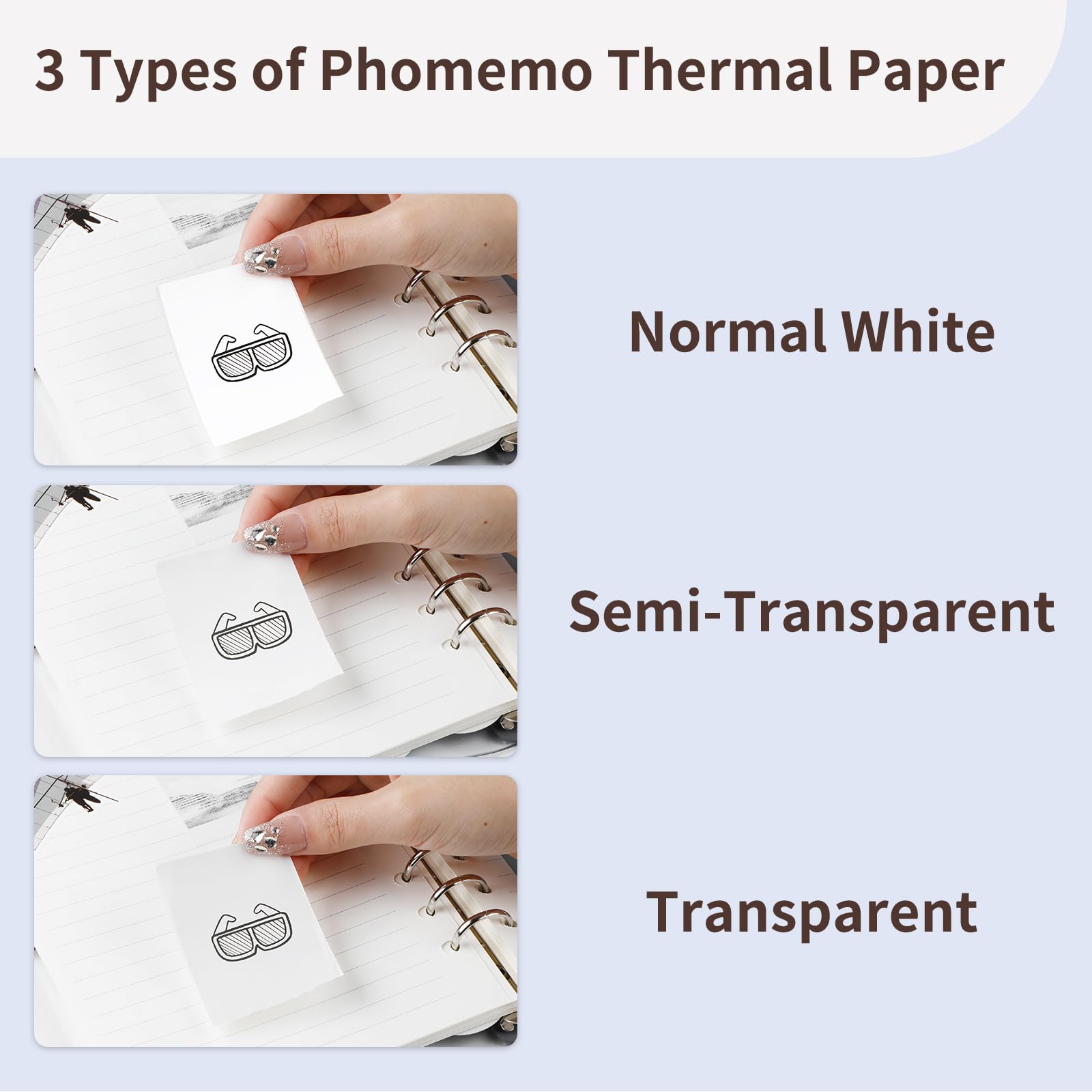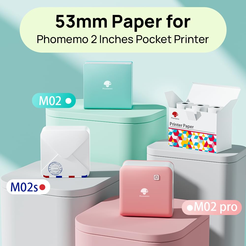 - Packungsinhalt – 3 Rollen Phomemo selbstklebendes Thermo-Farbaufkleberpapier – Weißes/Halbtransparentes/Transparentes. Produktgröße - 53 mm x 3,5 m (2,08'' x 137,8''); Kompatibel mit Phomemo M02/M02S/M02 Pro/M03/M03AS/M04S/M04AS Minidrucker.