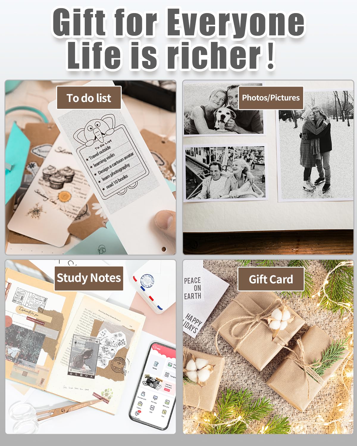 - Freely edit prints- please download the [Phomemo] app. With this app, you can easily edit notes, labels, mini banners, and even print photos or documents from your mobile phone. The app provides a wide range of pattern materials for use, and it is regularly updated with new content every month. Additionally, it supports 11 languages, ensuring accessibility for users worldwide. With the app, you have the freedom to print anything you desire