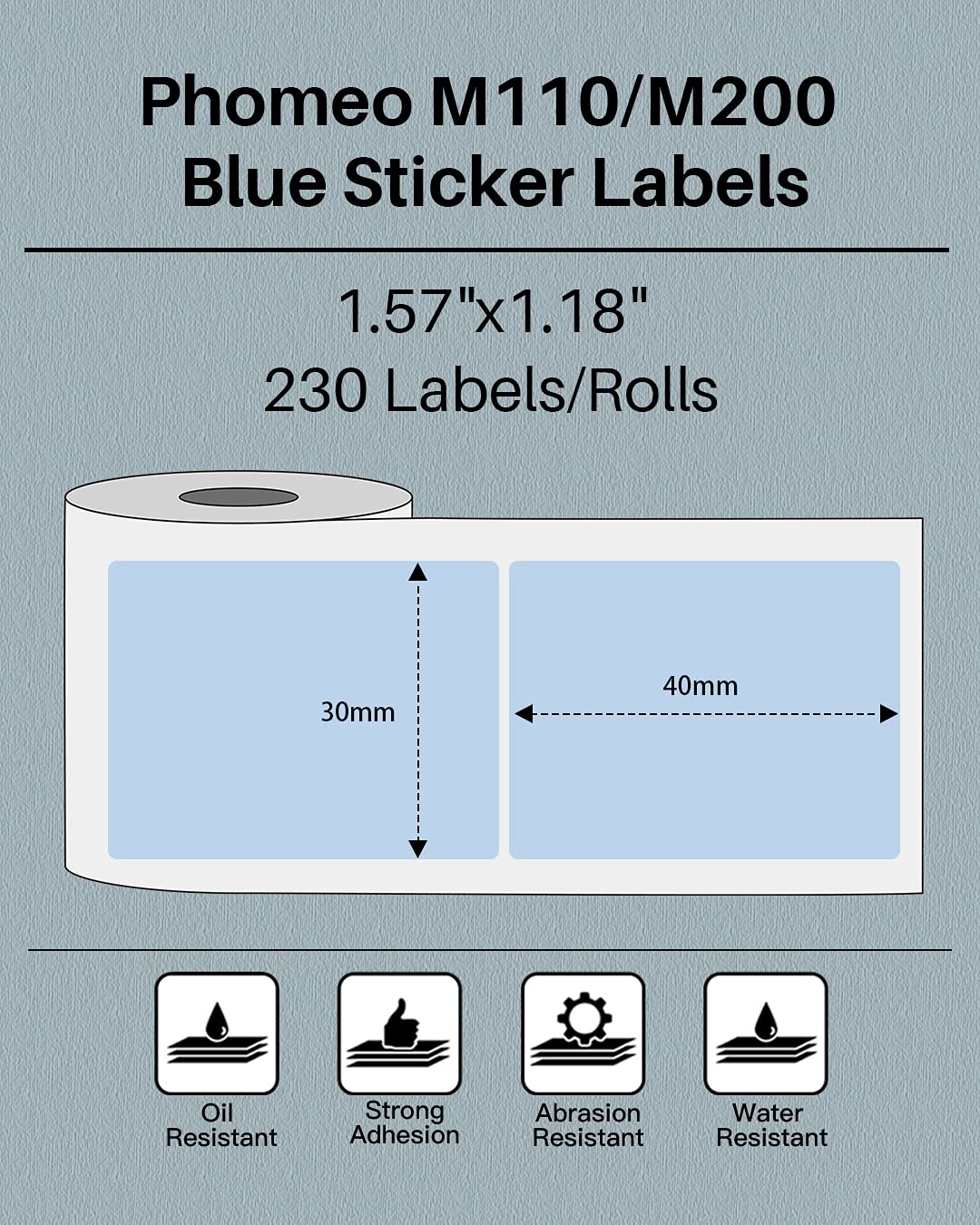 Phomemo Sticker Label M110/M221/M220/M120/M200/M110S Thermal Label- Black on Blue 1.57''x1.18''(40x30mm) for Small Business, Home, Office, 230 Labels/Roll