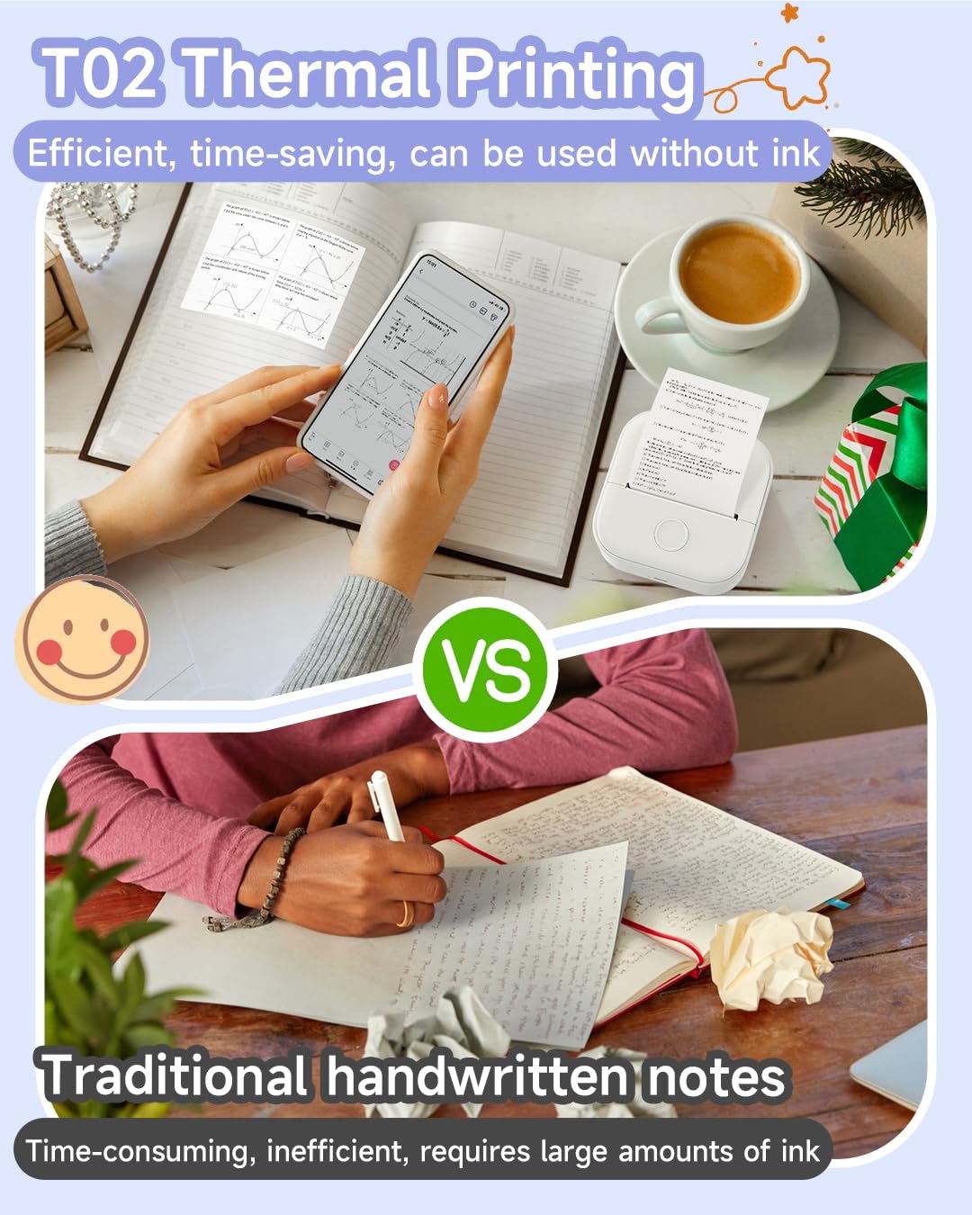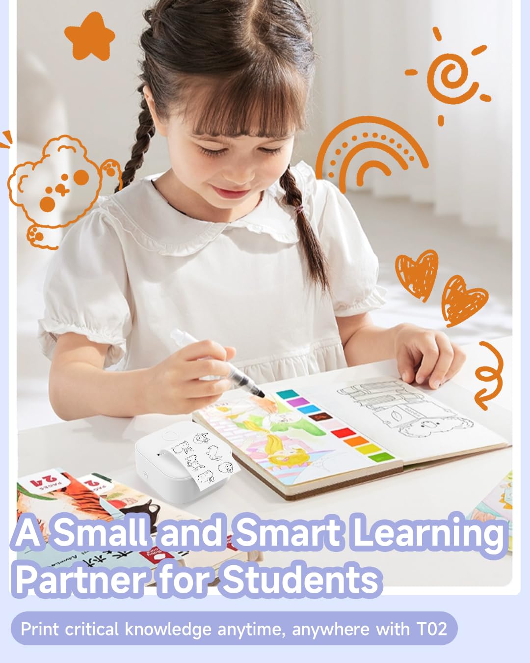 - Mini & Portable Pocket Printer- Print anytime, anywhere. T02 pocket-sized mini printer is designed for ultimate portability. Take it with you to classes, libraries, or coffee shops, and print whenever inspiration strikes. Embrace the convenience of a compact inkless printer
