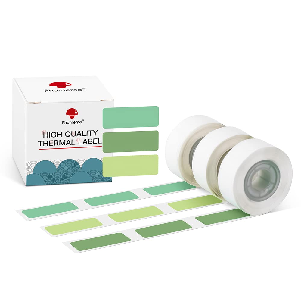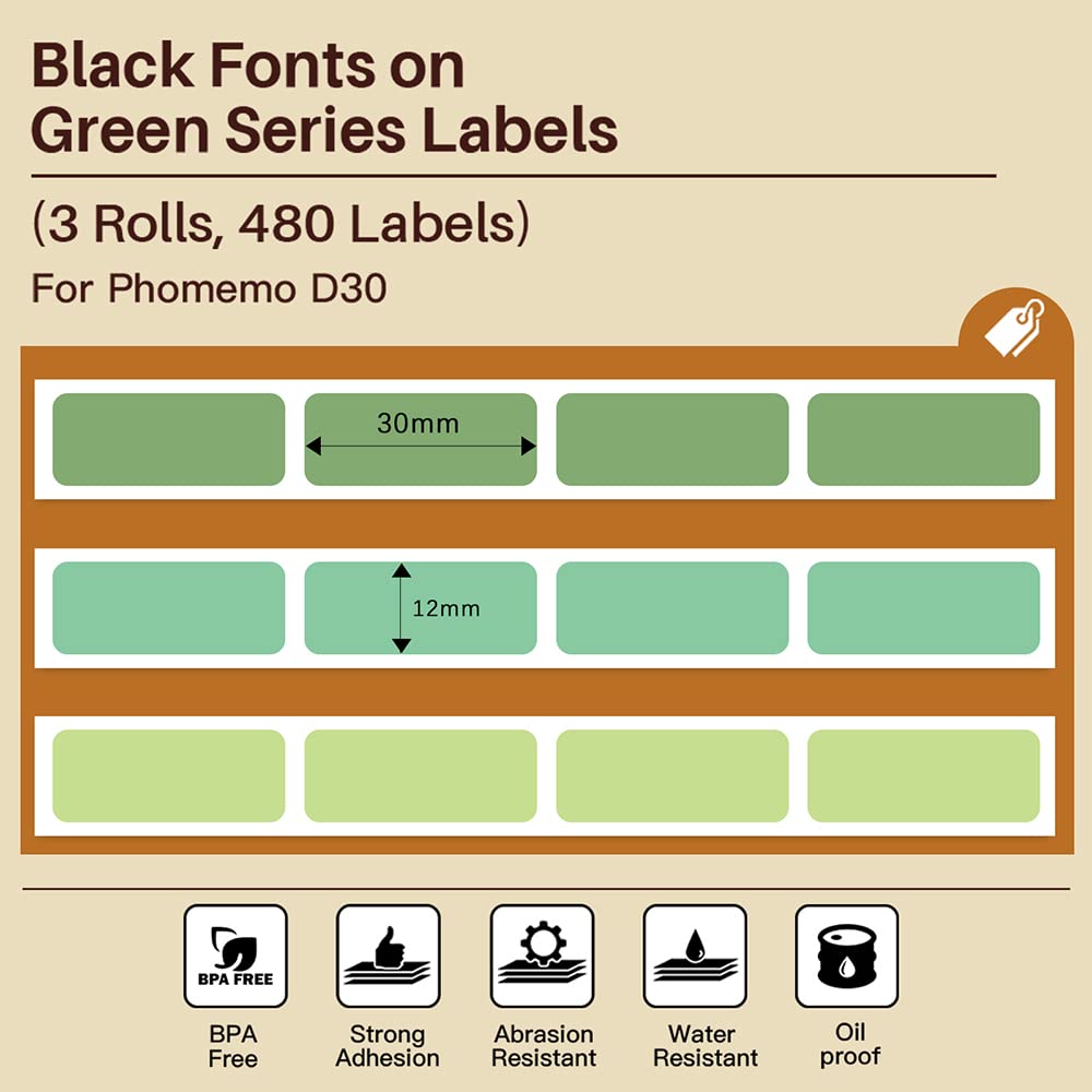 Phomemo Ta?ma do etykiet D30, zielona, 12 mm x 30 mm, kompatybilna z drukark? etykiet D30, termiczna, wodoszczelna etykieta, 3 rolki