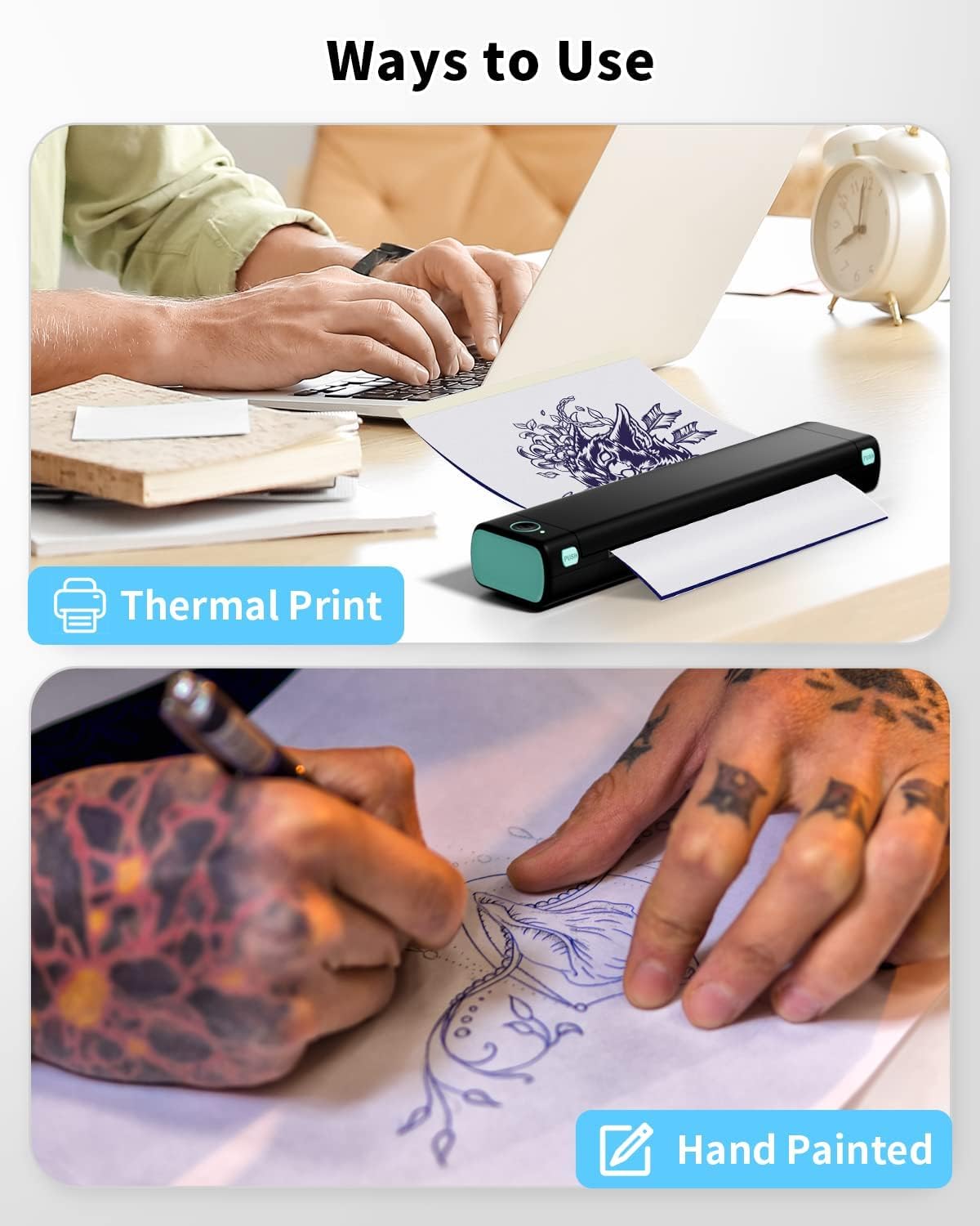- Two Ways To Use - The transfer paper copies the image you want onto the paper, then passes through the transfer paper, and finally reaches the skin. It is highly compatible with Phomemo M08F tattoo printer. Or use the ballpoint pen used for hand-drawn templates to draw the original design